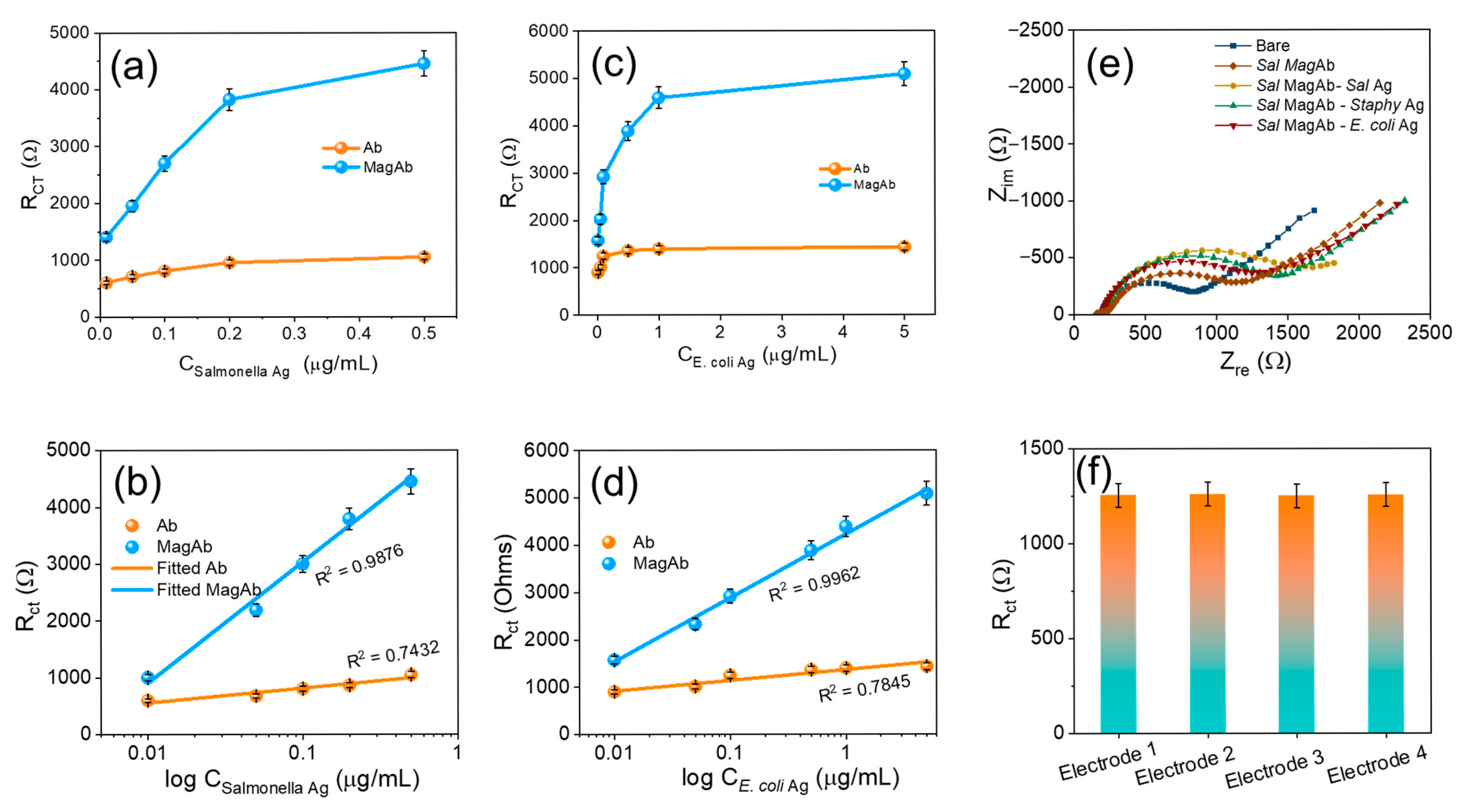 Figure 6. (a) The Rct due to the varying concentration of Salmonella antigen. (b) Corresponding linear fit of (a). (c) show the Rct due to the varying concentration of E. coli antigen. (d) Corresponding linear fit of (b). (e) Visualizes the cross-reactivity while varying the Ag with Sal MagAb and (f) reproducibility in different sets of electrodes. The Rct was calculated by Rct (Ab-Ag) − Rct (Ab), where Rct (Ab-Ag) is the value of the electron transfer resistance after antigen binding to antibody, Rct (Ab) is the value of the electron transfer resistance after the addition of antibody to the modified GC electrode. Each value of Rct was derived from three independent measurements.