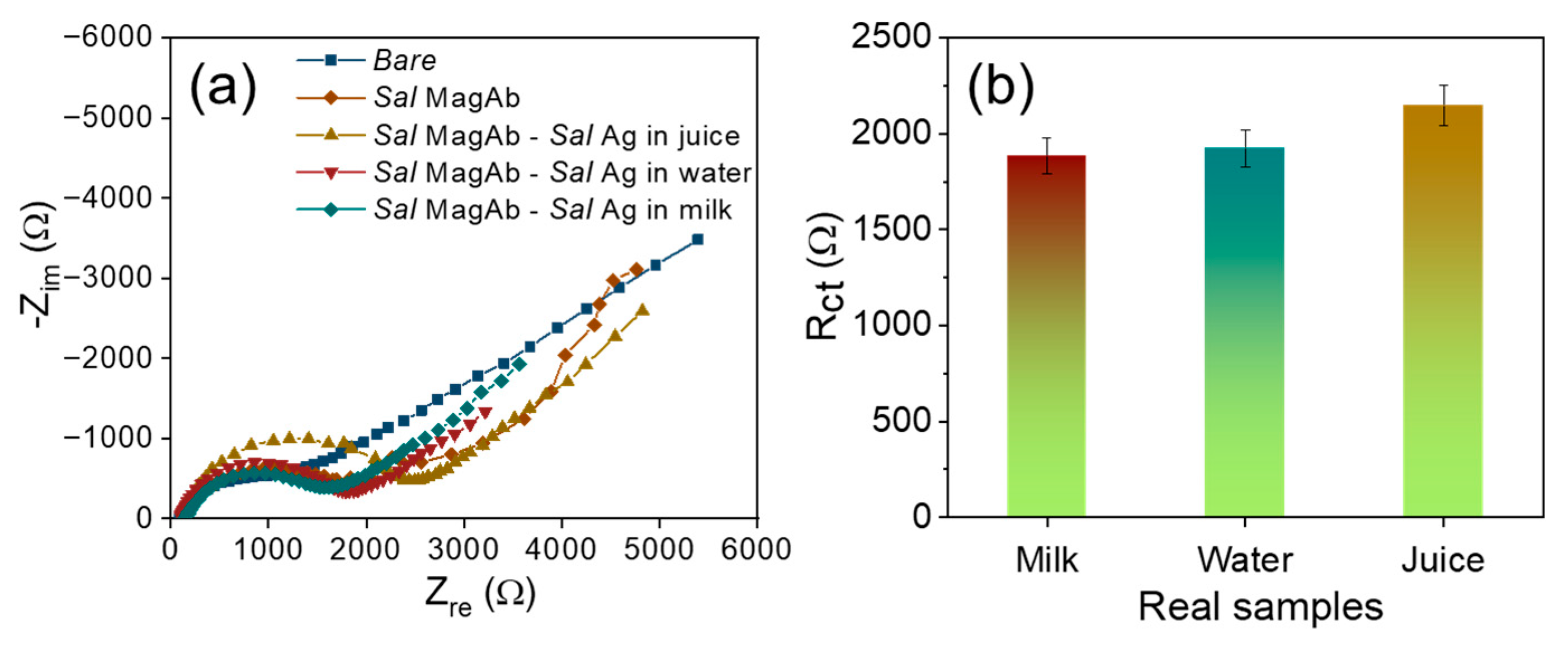 Figure 7. (a) Nyquist diagram and (b) the corresponding bar plot for the interaction of magnetosome antibody complex with various concentrations of S. aureus in real samples.