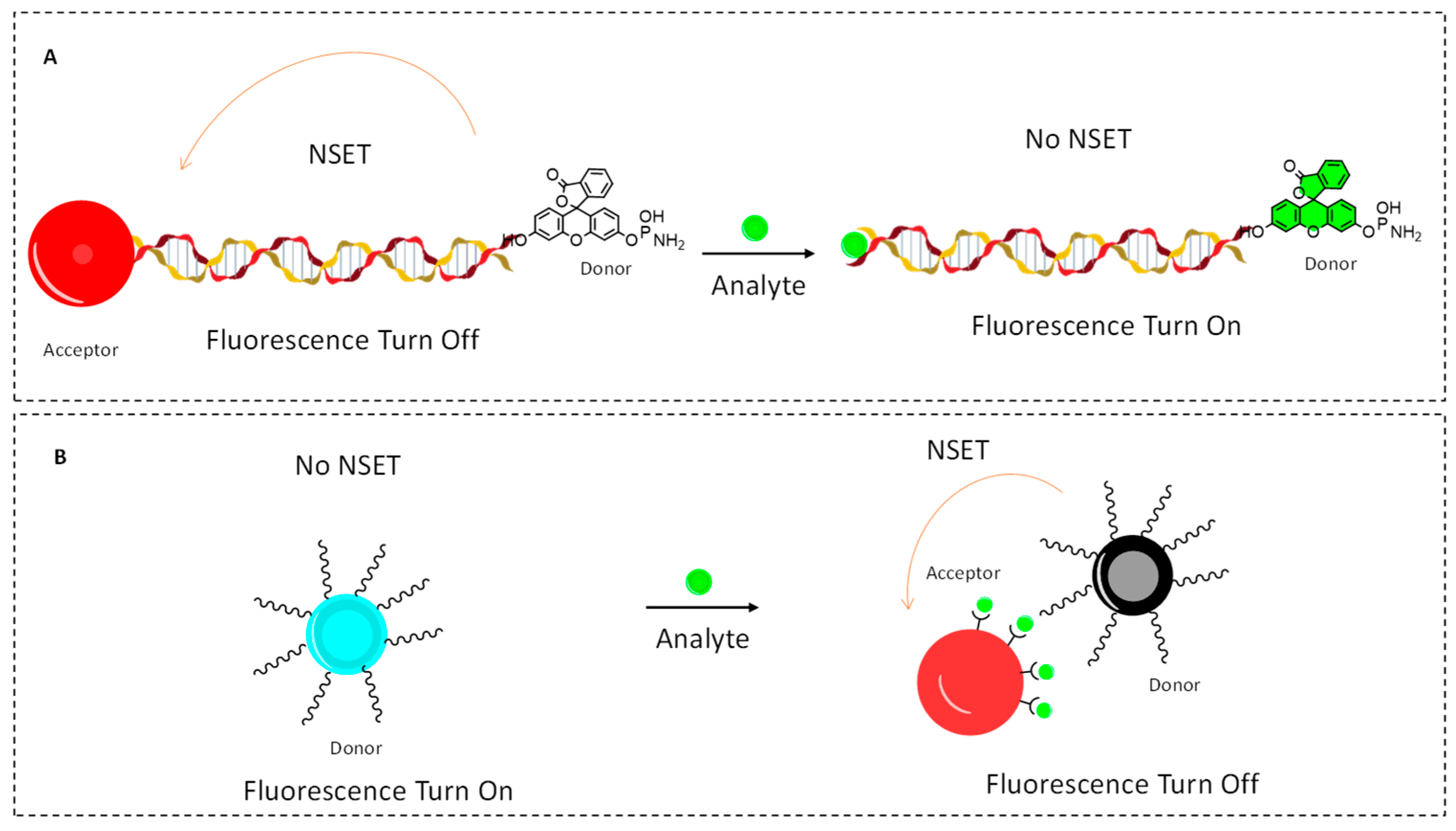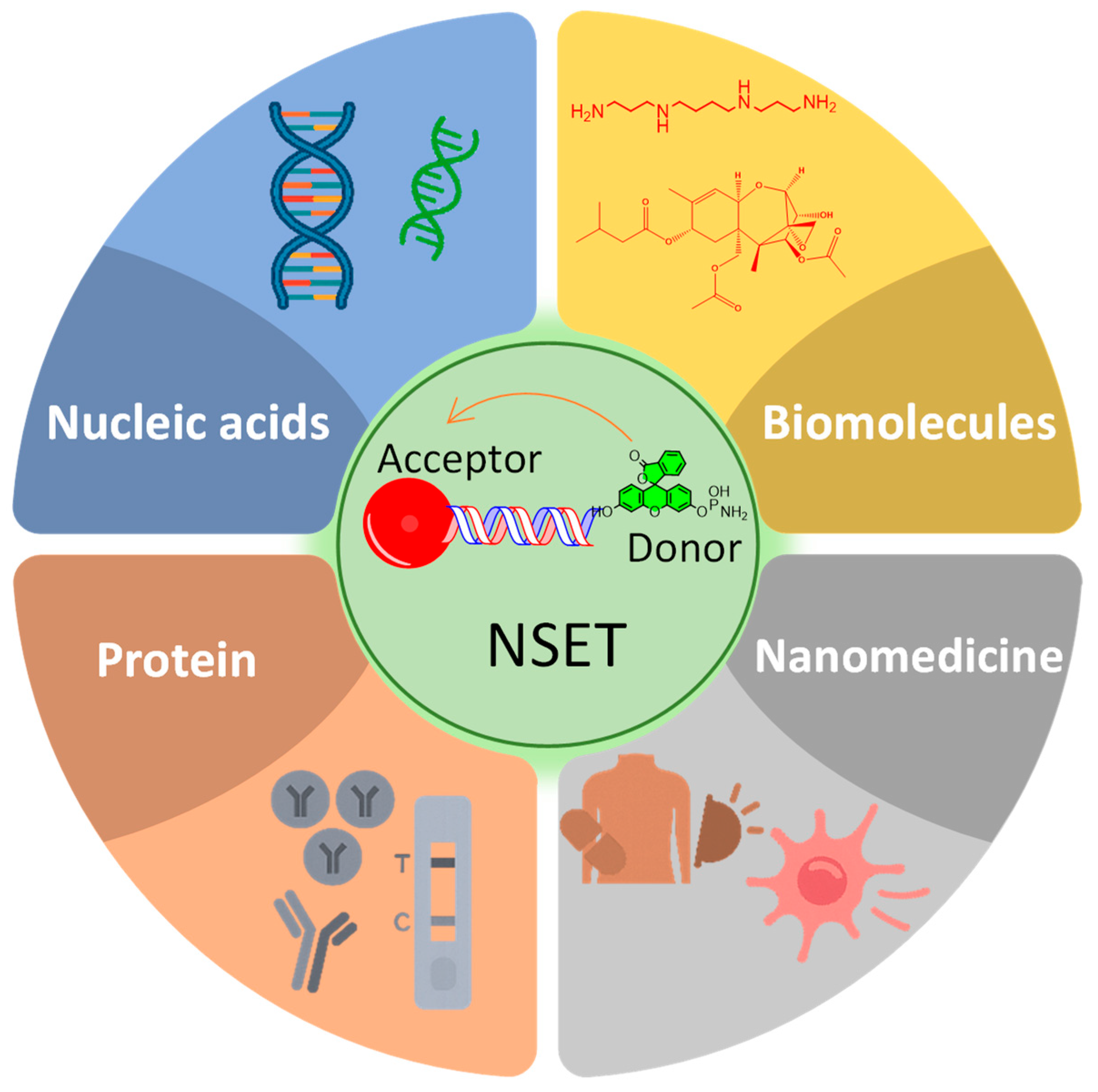 NSET-based platforms have demonstrated exceptional utility in biosensing. These quenching platforms have been used to detect nucleic acids, proteins, small molecules, and whole cells with high sensitivity and selectivity. Such systems often involve conjugating a fluorophore-labeled probe to a target analyte, bringing the donor in proximity to a metal nanoparticle upon binding, and resulting in quantifiable fluorescence quenching. Applications include detecting DNA hybridization, aptamer–target binding, and antigen–antibody interactions using NSET-based strategies [