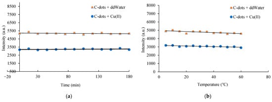 The synthesized C-dots exhibited stable fluorescence emission over a 3 h period, with no significant loss in photoluminescence intensity observed (Figure 2a). Temperature variations between 20 °C and 60 °C did not significantly affect the emission intensity, indicating good thermal stability (Figure 2b). The initial pH of the precursor solution played a critical role in C-dot formation. The pH sensitivity of the C-dots arises from the protonation and deprotonation of surface oxygen-containing functional groups, which influence the electronic energy levels [40]. Alkaline conditions were found to be more favourable for the synthesis process, with optimal fluorescence intensity obtained at an initial pH of 10.5 (Figure 2c). This pH value was naturally maintained due to the ionization of Tris, eliminating the need for external pH adjustment. C-dots demonstrated moderate pH sensitivity, retaining stable optical properties across a broad pH range of 3.0 to 9.0. However, under strongly alkaline conditions (pH > 11.0), a reduction in photoluminescence intensity was observed, potentially due to the formation of hydrogen bonds involving surface hydroxyl groups. These interactions may interfere with electron–hole recombination and disrupt radiative transitions, therefore causing fluorescence quenching [41].