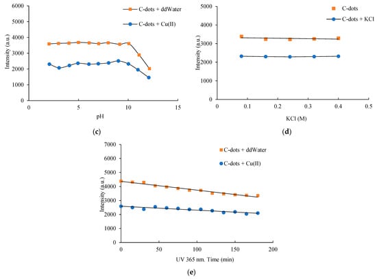 Effects of (a) reaction time, (b) temperature, (c) pH, (d) ionic strength, and (e) exposure duration on the stability of C-dots and C-dots complexed with Cu(II). All samples were incubated for 10 min, and their photoluminescence spectra were recorded under 352 nm excitation.