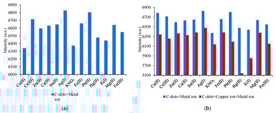 Evaluation of interference from various metal cations in the C-dot sensing system. (a) Histogram of photoluminescence intensity at 440 nm for C-dots in deionized water in the presence of different metal ions (excitation at 352 nm). (b) Comparison of photoluminescence intensity at 440 nm with and without additional Cu(II) ions. Red bars indicate the presence of Cu(II), while blue bars represent samples without Cu(II).