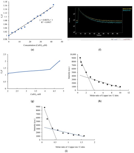 To investigate the binding stoichiometry between Cu2+ ions and C-dots, Job’s plot analysis was conducted [45]. At Cu2+:C-dot ratios greater than 1.5, a binding stoichiometry of approximately 2.53:1 was observed (Figure 4h). When the ratio dropped below 1.5, the stoichiometry shifted to approximately 1:2.5 (Figure 4i). The shift in stoichiometry is likely driven by the availability of surface functional groups relative to the metal ion concentration. At low Cu2+ concentrations (C-dots in excess), multiple functional groups on the C-dot surface (such as hydroxyl and amino groups) may coordinate with a single copper ion, or a single C-dot may chelate multiple dispersed Cu2+ ions independently, leading to a stoichiometry favouring C-dots (1:2.5). Conversely, at high Cu2+ concentrations (Cu2+ in excess), the surface sites become saturated, and copper ions may induce bridging between C-dots or form clusters on the surface, shifting the apparent stoichiometry (2.5:1).
