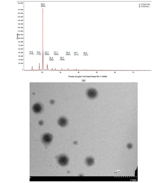 Figure 5a represents the XRD patterns of C-dots. XRD revealed the crystallinity of C-dots formed from C domains surrounded with an amorphous carbon network [50]. The C-dots in this study exhibited a primary diffraction peak centered at 2θ = 20.4°, corresponding to the (002) plane. Additionally, other peaks centered at 14.4°, 18.4°, 22.7°, 25.4°, 27.1°, 30.7°, 34.2°, 38.7°, and 44.0° were identified as the (110), (110), (002), (002), (002), (004), (002), (111), and (101) reflections of C-dots, while a peak at 79.9° could not be identified. Peaks attributed to the (100) and (101) planes represented a higher number of oxygen-containing groups, as found in earlier studies [51,52,53]. C-dots showing several distinctive peaks indicate a polycrystalline structure (Figure 5a) [54]. C-dots are often amorphous, and this type of C-dots with polycrystalline organization is not common in the literature [55]. The XRD peak shape indicates that the C-dots exhibit a crystalline structure with an average grain size (D) ranging from 2 to 20 nm, calculated using Scherrer’s formula [55]. The C-dot–Cu2+ composite pattern shows the characteristic peak (002) shifted to 2θ = 20.02°. In addition, the intensity of all diffraction peaks either increased or decreased after the interaction with the Cu2+ due to the increase of the inter-planar distance (002), possibly due to Cu2+ trapped by C-dot sheets.