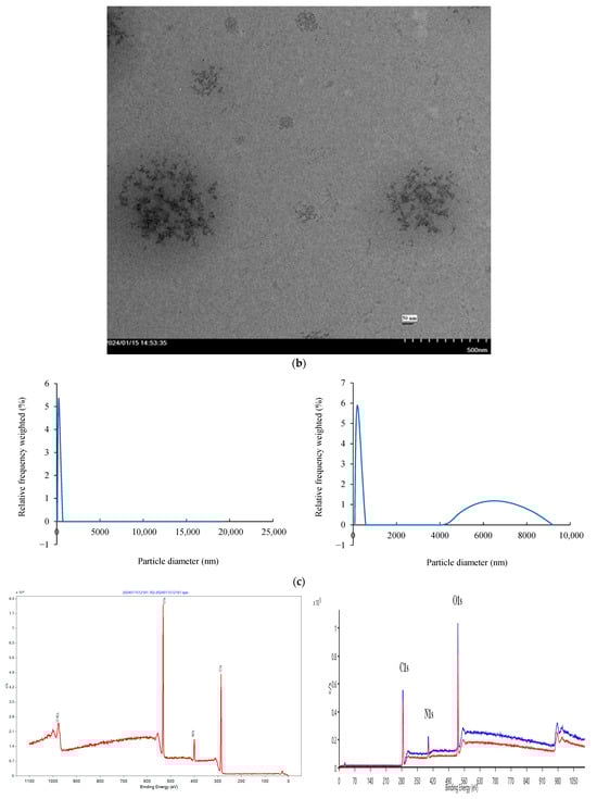 The optical properties of C-dots were characterized in terms of the fluorescence and UV–vis spectra. Figure 1a illustrates a stable emission wavelength behavior in the fluorescence emission spectra of C-dots across different excitation wavelengths ranging from 250 to 420 nm. The emission peaks of C-dots shifted with different excitation wavelengths, yet the maximum emission wavelength remained consistent at around 440 nm. This excitation-independent emission property distinguishes these C-dots from many previously reported types, potentially minimizing autofluorescence in practical applications [37,38]. This characteristic is attributed to the uniform particle size distribution and localized surface state band structure of the C-dots [39]. As shown in Figure 1b, the maximum emission wavelength of C-dots was located at 440 nm at an excitation wavelength of 352 nm. In aqueous solution, C-dots exhibited a UV absorption peak at 256 nm, as shown in Figure 1c, corresponding to π–π transitions of C=C bonds and n–π transitions of C-OH groups [27]. The quantum yield of the synthesized C-dots was approximately 5.73%, as determined using quinine hemisulfate (quantum yield ~54%) as the reference standard (Supplementary Figures S1 and S2).