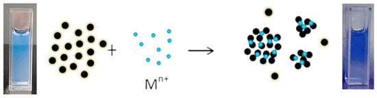 Fluorescent carbon dots (C-dots) have garnered significant attention in research due to their wide range of applications, unique optical properties, biocompatibility, low toxicity, solubility in water, high stability, and other exceptional features [15,16,17]. To date, C-dots have been used for sensors [15,18], bioimaging [19,20], electrocatalysis [21,22], photocatalysis [21,22,23], drug delivery [20,24,25], and in optoelectronic applications [24,26]. The synthesis of C-dots can be achieved through top-down or bottom-up methods, with the latter offering more control over optical properties, higher yields, and improved carbonation [17,27]. The sizes, compositions, and crosslinking-enhanced emission effects of C-dots are the three key parameters that influence their optical and electrical properties [17,18,22,27]. During the initial polymerization stage of C-dots, the fluorescence emission mechanism is mainly associated with the molecular state of the preliminary polymers. As the C-dot polymer structures develop, crosslinking-enhanced emission effects start to dominate, and carbon nuclei gradually appear with the increasing degree of carbonization. This process leads to the formation of a carbon core, resulting in a core–shell structure. Simultaneously, the fluorescence emission mechanism shifts to rely on the carbon nucleus, particle size, and surface states. Importantly, the surface state is determined by the hybridization of the carbon skeleton with its attached chemical groups, rather than by isolated side chains or functional groups. The size effect will eventually become predominant once complete carbonization is achieved with surface functional groups and side chains disappear [17,18,22,27]. To modify these characteristics, functionalization techniques such as surface modification or intrinsic heteroatom doping can be employed [22,24,27]. However, the stability of C-dots remains a challenge in many applications, although post-surface treatments have shown promise in addressing this issue. Notably, C-dots have been successfully utilized as fluorescence probes for the detection of metal ions [28].