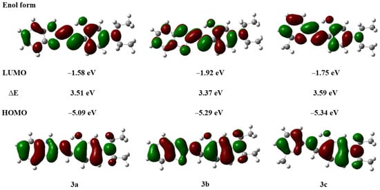 Frontier molecular orbitals and energy levels of compounds 3a–3c (enol form).