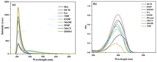 (a) Fluorescence spectra and (b) UV–vis absorption spectra of compound 3c (10 μM) in different solvents.
