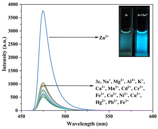 Similarly, only the addition of Zn2+ to the solution of compound 3b enhanced the fluorescence intensity at 515 nm, changing the fluorescence color from blue-green to yellow-green (Figure S14). For compound 3c, only the addition of Zn2+ enhanced the fluorescence intensity at 474 nm, resulting in a bright blue color (Figure 9).
