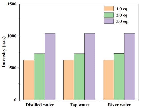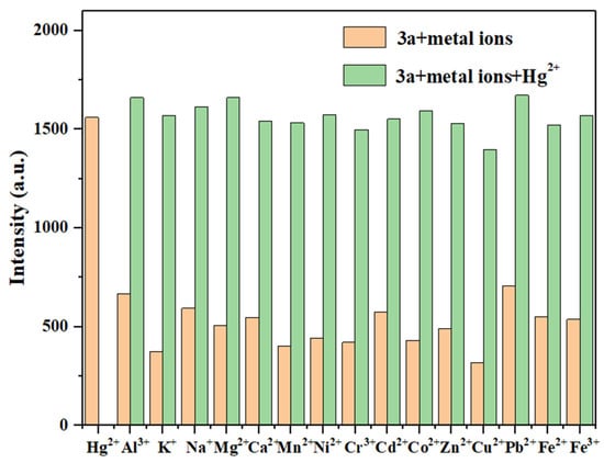 When mixing probe 3a (10 μM) with 11 equivalents of Hg2+ and 11 equivalents of other competing metal ions, as shown in Figure 10, the fluorescence intensity of 3a showed no significant changes in the presence of most competing metal ions. However, there was a significant fluorescence enhancement with the subsequent addition of Hg2+. This indicates that most competing metal ions do not significantly interfere with the detection of Hg2+ by probe 3a. Combined with its low LOD and rapid response, this indicates its potential application value in environmental monitoring.