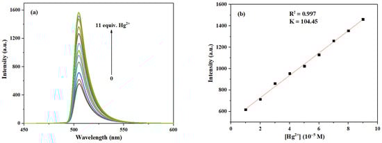 As shown in Figure 12, with the gradual increase of Hg2+ concentration from 0 to 11.0 eq., the fluorescence intensity at 505 nm was progressively enhanced. Furthermore, the fitting curve reveals a good linear relationship (R2 = 0.997) between the fluorescence intensity of probe 3a and the concentration of Hg2+. Thus, the LOD for Hg2+ can be calculated to be 3.21 × 10−7 M, which is significantly lower than those of most fluorescent probes for Hg2+ reported before [43,44] (see Table S3 for more detailed comparison).