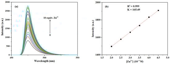 Similarly, as shown in Figure S16, the fluorescence intensity at 515 nm increased with the rising concentration of Zn2+ from 0 to 11.0 eq. Moreover, the fitting curve shows a good linear relationship (R2 = 0.997) between the fluorescence intensity of probe 3b and the Zn2+ concentration. The LOD of probe 3b for Zn2+ can be calculated to be 1.61 × 10−7 M. Although probes with even lower LODs have been reported [24], this value remains significantly lower than those of most previously reported fluorescent probes for Zn2+ [45,46] (see Table S4 for more detailed comparison).