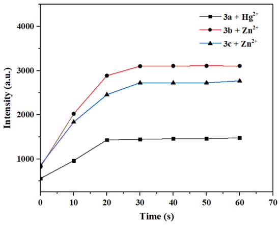 The response time of a fluorescent probe to metal ions is crucial for its application in real-time detection [47]. Therefore, 10.0 eq. of Hg2+/Zn2+ solution was rapidly added to the solutions of probes 3a–3c, and their fluorescence intensities were measured at different time intervals to investigate the relationship between maximum fluorescence intensity and time.