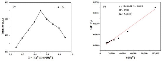 As shown in Figure 15, the Job’s plot shows a maximum intensity at a molar fraction of 0.5 for Hg2+, indicating a 1:1 binding stoichiometry for the complex formed between probe 3a and Hg2+. Furthermore, the association constant (Ka) was determined via the Benesi–Hildebrand equation by linear fitting of the fluorescence titration data [49]. The Ka value for the binding of 3a with Hg2+ can be calculated to be 5.48 × 103 M.