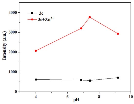 It is well known that the pH of the environment has a significant impact on the selectivity, sensitivity, and practical application of a probe [39]. Therefore, the maximum fluorescence intensity of solutions of probes 3a–3c was measured and compared before and after their interaction with Hg2+/Zn2+ under different pH solutions (pH = 4.00, 6.86, 7.40, 9.18) (Figure 17, Figures S19 and S20).
