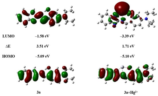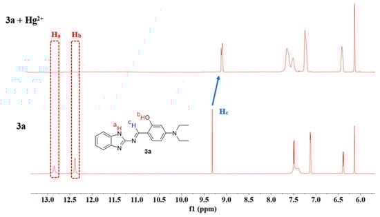 Based on the Job’s plot results, the stoichiometric ratio of the complex formed between compound 3a and Hg2+ has been determined to be 1:1. To further elucidate the recognition mechanism of 3a toward Hg2+, 1H NMR and ESI-MS studies were conducted [51].