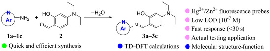 Based on our previous research on the synthesis of AIE-functional molecules [25] and ESIPT probes [26], we synthesized three Schiff base fluorescent probes 3a–3c (Scheme 1) by reacting 4-diethylaminosalicylaldehyde with various N-heterocyclic amines, including 2-aminobenzimidazole, 2-aminobenzothiazole, and 2-amino-6-methyl-pyridine. The test results showed that compounds 3a–3c have both AIE and ESIPT characteristics. Compound 3a can detect Hg2+, while compounds 3b and 3c can detect Zn2+ with lower detection limits in a shorter response time based on a turn-on ESIPT–CHEF mechanism.
