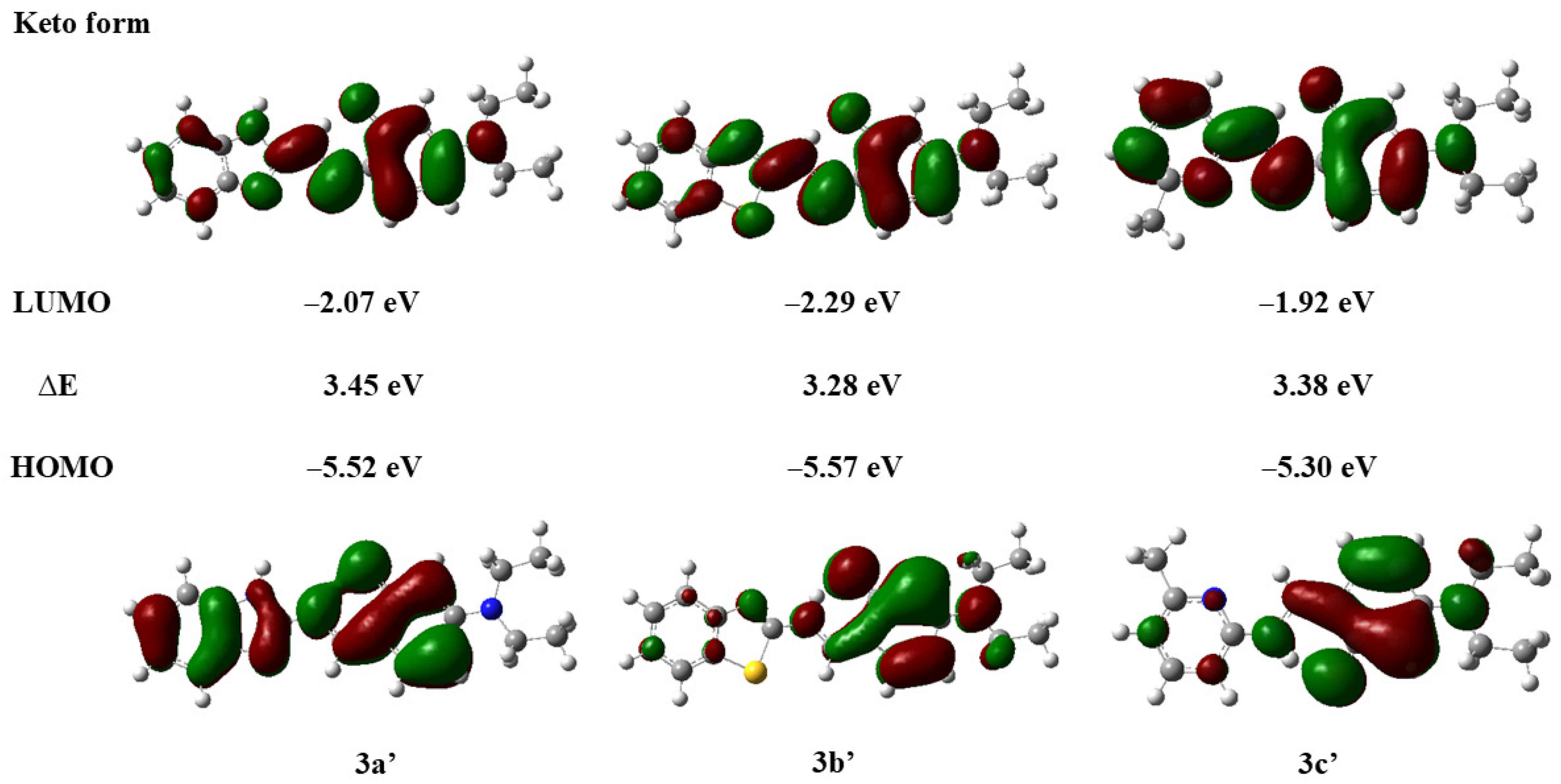 Frontier molecular orbitals and energy levels of compounds 3a′–3c′ (keto form).