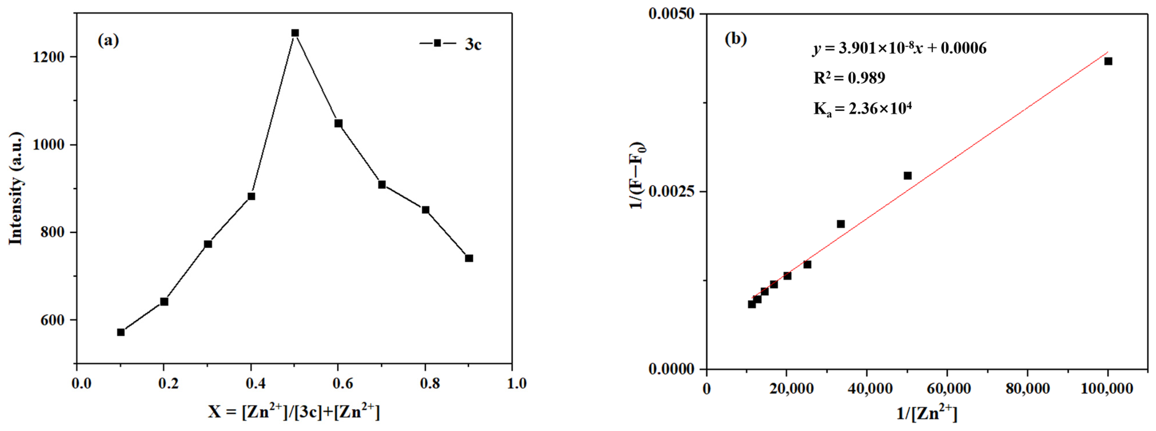 (a) The Job’s plot of 3c-Zn2+; (b) The Benesi–Hildebrand plot of 3c-Zn2+.