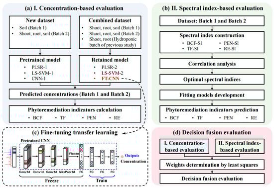 Flowchart of data analysis process: (a) phytoremediation evaluation based on concentration prediction; (b) phytoremediation evaluation based on spectral index; (c) schematic of fine-tuning transfer learning; (d) integration of concentration-based and spectral index-based evaluation. Conv1d: convolutional layer; MaxPool1d: max pooling layer; FC: fully connected layer.