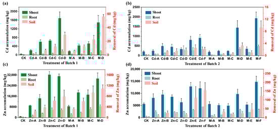 Cd concentration in S. alfredii and removal from the soil of (a) Batch 1 and (b) Batch 2; Zn concentration in S. alfredii and removal from the soil of (c) Batch 1 and (d) Batch 2. The black y-axis titles correspond to the metal accumulation in shoots and roots, while the red y-axis titles correspond to the metal removal from the soil.