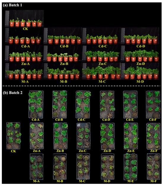 Cd and Zn accumulation in S. alfredii, and their removal from soils, as measured by ICP-OES, are shown in Figure 2. The accumulation generally increased with higher treatment levels. However, accumulation appeared to reach saturation in groups of high treatment levels (e.g., Zn-C and Zn-D groups in Batch 1, and Zn-E and Zn-F groups in Batch 2). As a hyperaccumulator, S. alfredii efficiently took up Cd and Zn through roots and translocated them to shoots, resulting in significantly higher accumulation in shoots than in roots in most groups. In this study, as shown in Figure 3, the plants in Batch 1 exhibited better growth than those in Batch 2, leading to higher Cd and Zn accumulation in plants and greater soil metal removal in Batch 1.