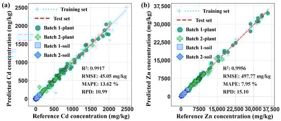Regression plots of FT-CNN models for (a) Cd and (b) Zn quantification in two batches of plants and soils. The light blue crosses represent the training set samples, and the dotted line represents the fitting line. The red dashed line represents the fitting line of the test set. The test set samples are distinguished by symbols: green circles for Batch 1 plants, light green crosses for Batch 2 plants, light blue squares for Batch 1 soil, and deep blue diamonds for Batch 2 soil. Note that the data points for soil samples are clustered near the origin due to their relatively low heavy metal concentrations compared to plant samples.