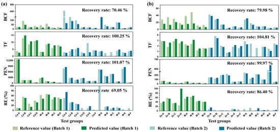 Based on FT-CNN models, Cd and Zn concentrations in shoots, roots, and soils from both batches were predicted, and phytoremediation indicators were calculated and compared with reference indicators. The results for the Cd and Zn test sets are shown in Figure 5.