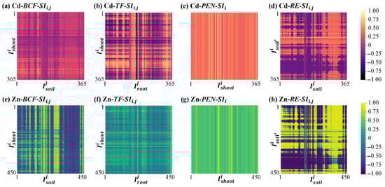 Correlation heatmap between spectral indices (BCF-SI, TF-SI, PEN-SI, and RE-SI) and phytoremediation indicators (BCF, TF, PEN, and RE) for (a–d) Cd dataset and (e–h) Zn dataset.
