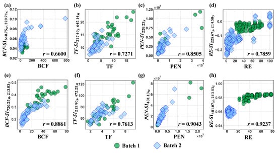 Spectral indices with the highest correlation to reference indicators were selected, which were BCF-, TF-, PEN-, and RE- for Cd, and BCF-, TF-, PEN-, and RE- for Zn. The subscripts S and M following wavelengths represent SR-500i and ME5000, respectively. The relationships between these optimal spectral indices and reference indicators are shown in Figure 7. Among the selected spectral indices, the spectral feature wavelengths were close to or overlapped with the characteristic peaks of Cd and Zn according to the National Institute of Standards and Technology (NIST) database. For the Cd dataset, the spectral indices TF-, PEN- and RE- showed good correlations with TF, PEN, and RE, respectively (r > 0.7), while BCF- had a relatively weak correlation with BCF (r = 0.66). For the Zn dataset, the correlations of the spectral indices with reference indicators were higher than those for Cd, with all correlations exceeding 0.76. Among these, PEN- and RE- had very strong correlations with PEN and RE, respectively, with r over 0.9. For samples of both Batch 1 and Batch 2, the overall trends were consistent, with some overlap in the data distribution for TF and PEN indicators. The data distribution for RE showed a clear separation between samples of two batches, due to significant differences in the soil heavy metal removal effectiveness between the two batches of plants.