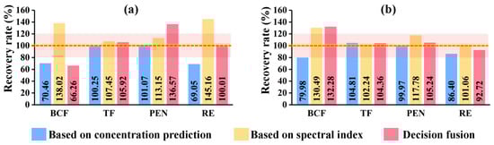 Comparison of phytoremediation evaluation methods based on concentration prediction, spectral index, and decision fusion for (a) Cd dataset and (b) Zn dataset. The horizontal dotted line represents a recovery rate of 100%, and the pink shaded area represents the acceptable recovery range (80–100%).