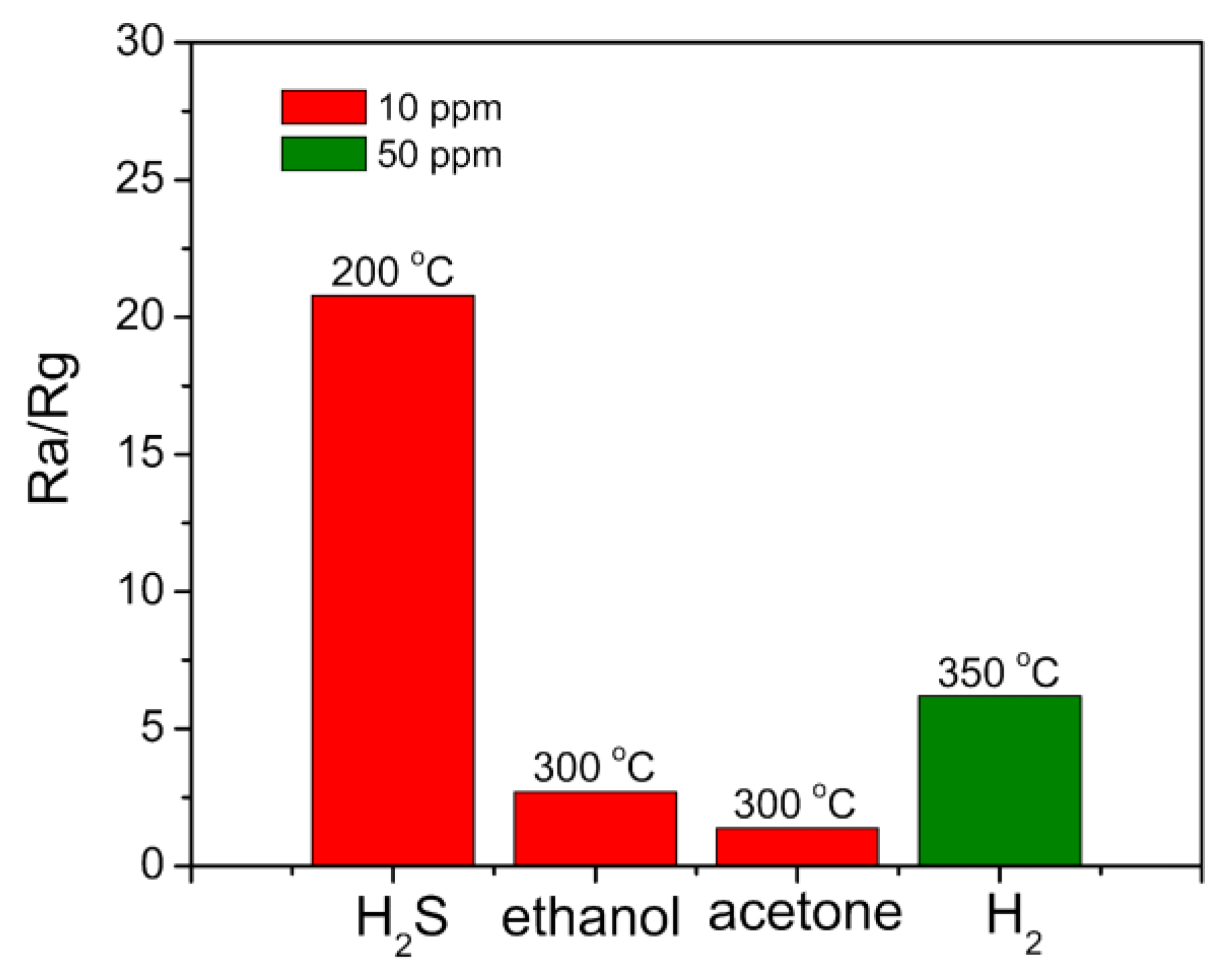 - Zhao, N.; Chen, Z.; Zeng, W. Enhanced H2S sensor based on electrospun mesoporous SnO2 nanotubes. J. Mater. Sci. Mater. Electron. 2015, 26, 9152–9157. [Google Scholar] [CrossRef]