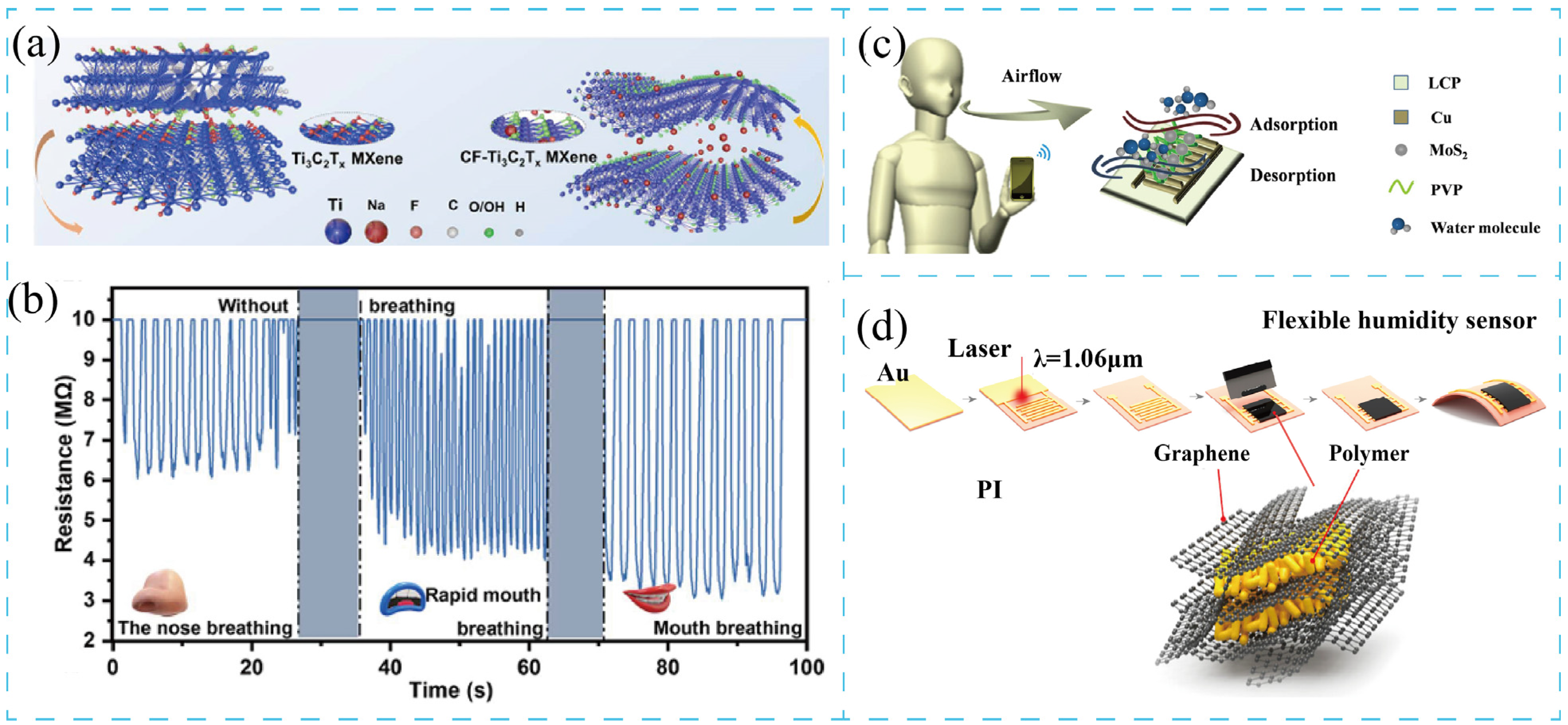 - Han, Y.; Cao, H.; Cao, Y.; Wen, X.; Yao, Y.; Zhu, Z. Fast response flexible humidity sensors based on Ti3C2Tx MXene-heterostructures for multifunctional applications. J. Mater. Chem. C 2024, 12, 4809–4816. [Google Scholar] [CrossRef]
