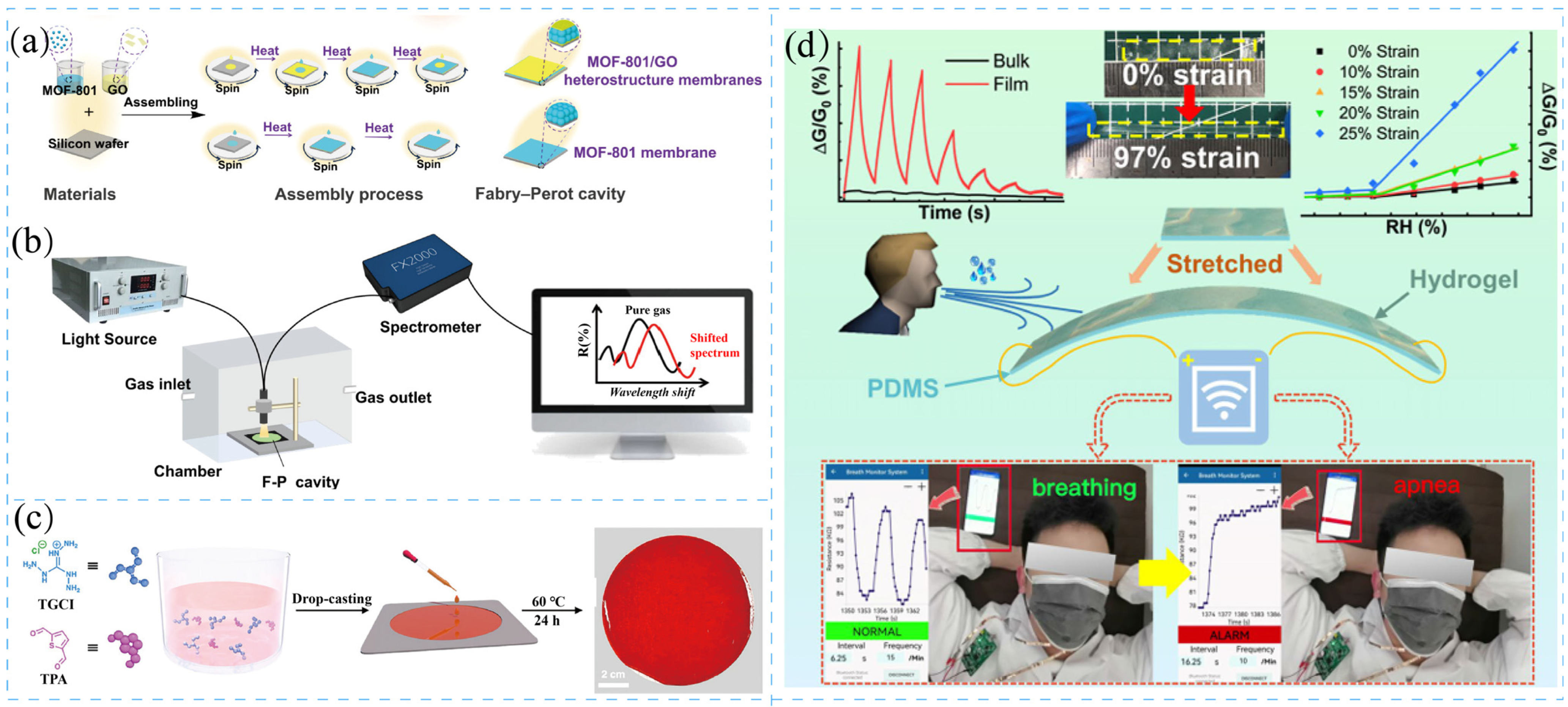 - Zhang, Z.; Chen, Y.; Tian, Y.; Li, H.; Lu, Z.; Yang, L. Fabry-Pérot Cavity Based on Metal-Organic Framework/Graphene Oxide Heterostructure Membranes for Humidity Sensing. ACS Appl. Nano Mater. 2024, 7, 6148–6158. [Google Scholar] [CrossRef]