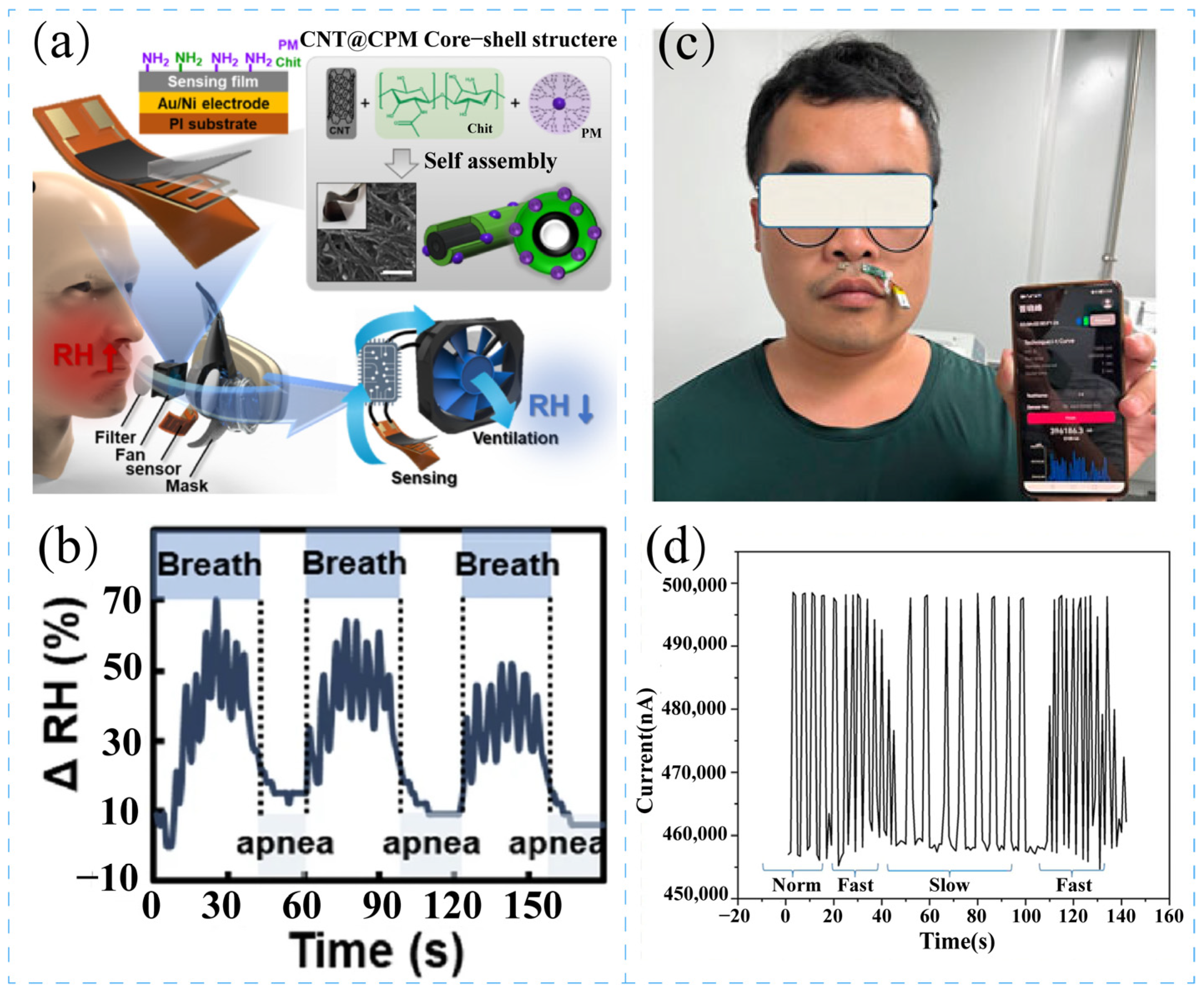 - Jin, X.; Zha, L.; Wang, F.; Wang, Y.; Zhang, X. Fully integrated wearable humidity sensor for respiration monitoring. Front. Bioeng. Biotech. 2022, 10, 1070855. [Google Scholar] [CrossRef] [PubMed]