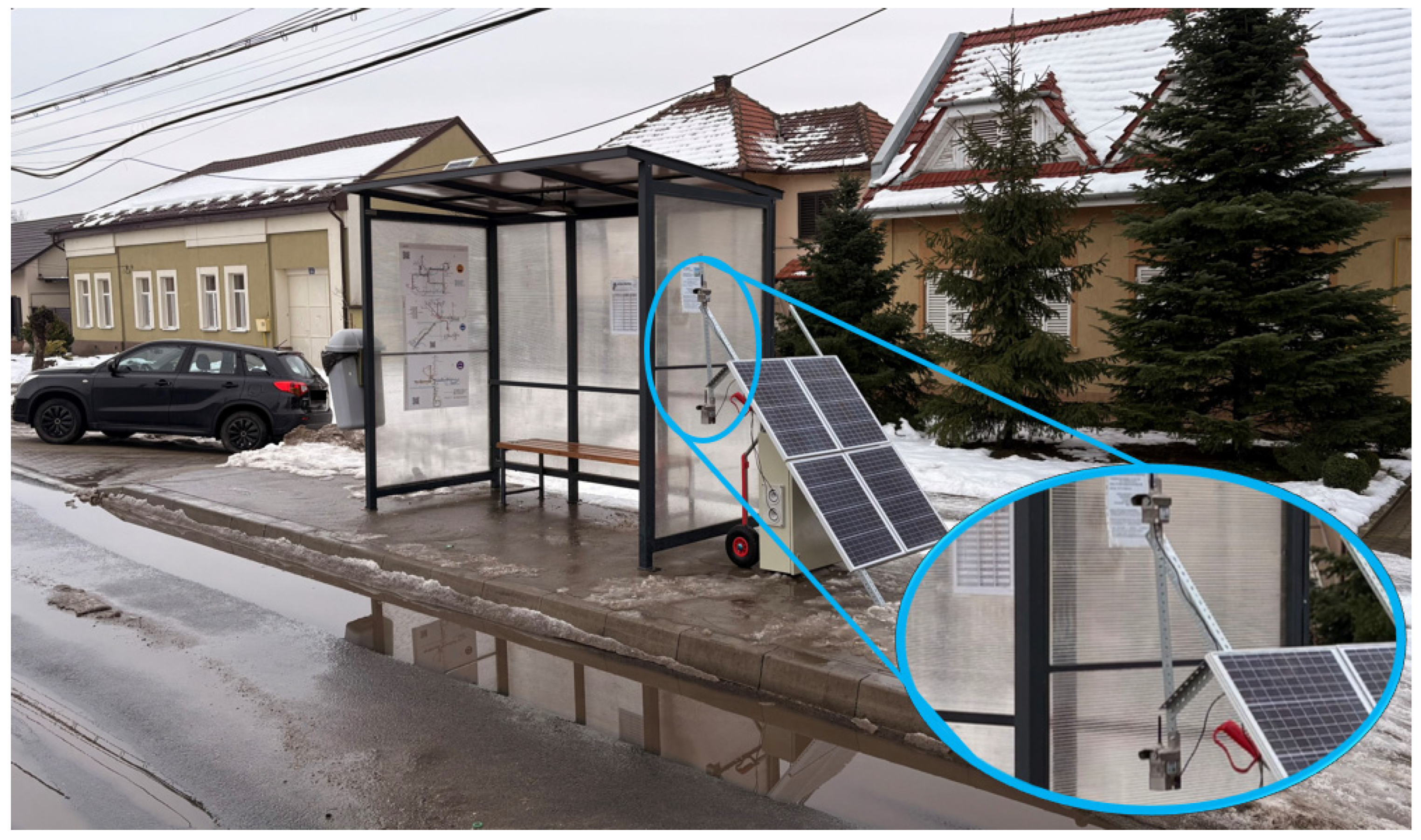 A photograph of the mobile, solar-powered air quality monitoring system deployed at the roadside public transport stop is shown in