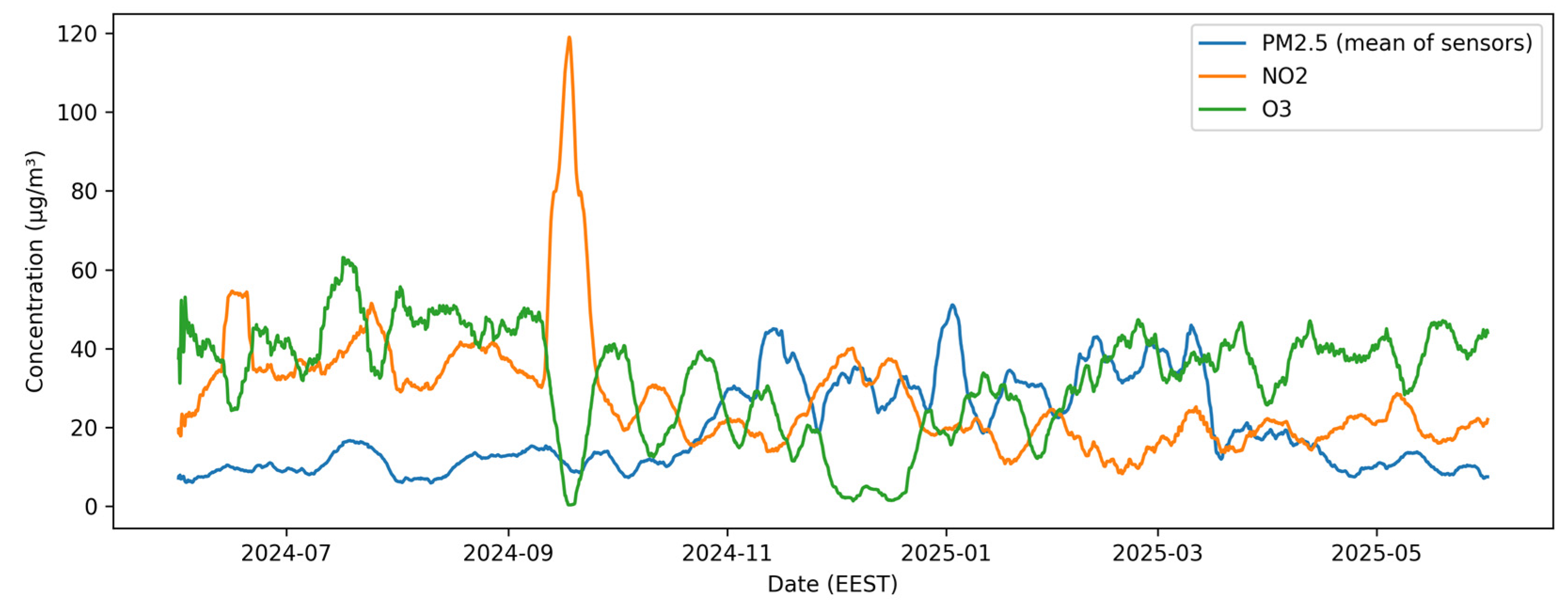 Signal filtering, temperature and humidity compensation for the electrochemical sensors, and low-level data preprocessing are implemented within the manufacturer’s platform and are not publicly disclosed. The present analysis was based on quality-controlled hourly outputs provided by the system, with additional averaging and validation steps described herein.