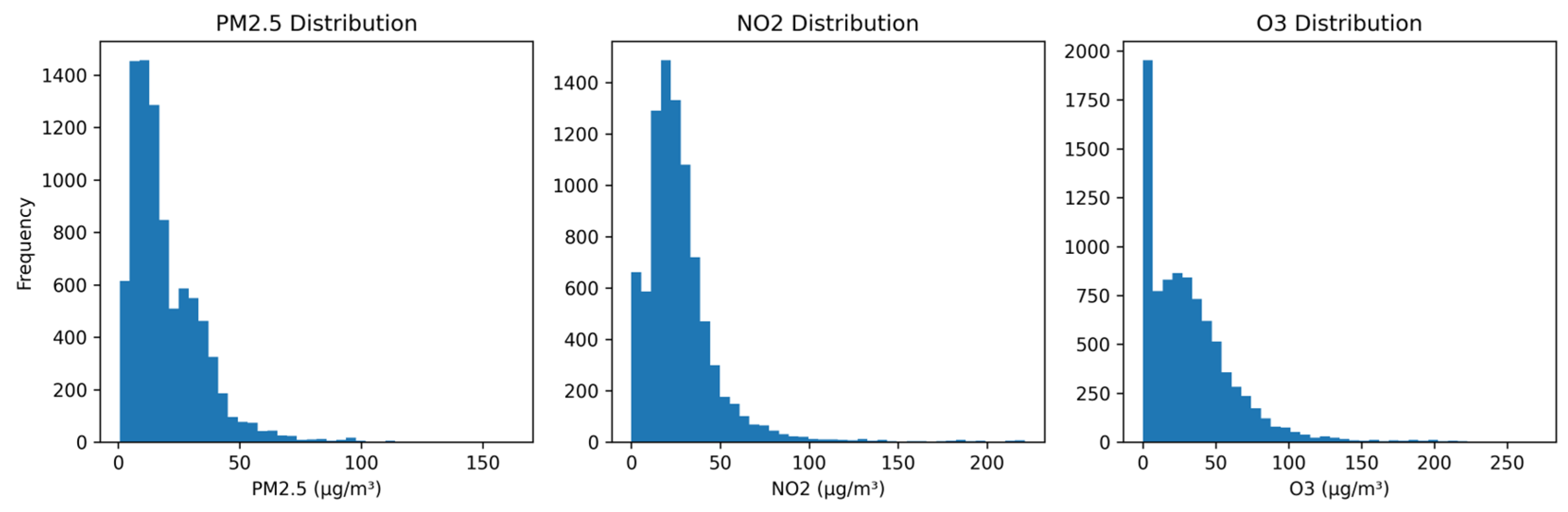 Short-term predictive models, shown in the Results Section, were trained using the full set of valid hourly observations collected over the one-year monitoring period. The training dataset included pollutant concentrations (PM2.5, NO2, and O3), concurrent meteorological variables (air temperature, relative humidity, atmospheric pressure, wind speed, and wind direction), and temporal indicators (hour of day, day of week). Autoregressive terms, consisting of pollutant concentrations from preceding hours, were included to capture short-term persistence. Model training and evaluation were performed using temporally ordered data to preserve the chronological structure of the time series.