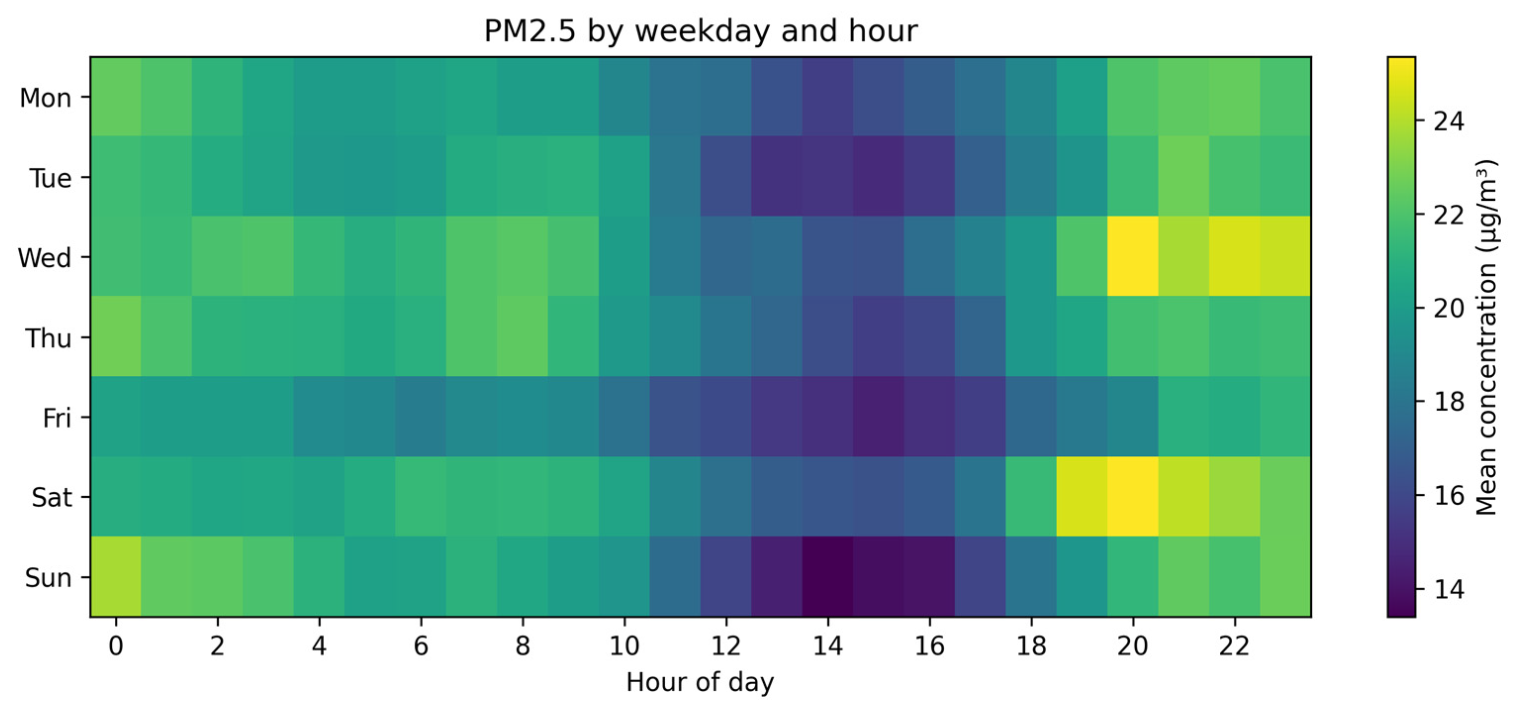 5 concentrations exhibit clear weekday-dependent patterns, with distinct morning and evening peaks occurring during typical commuting hours and reduced concentrations during late night and early morning periods (