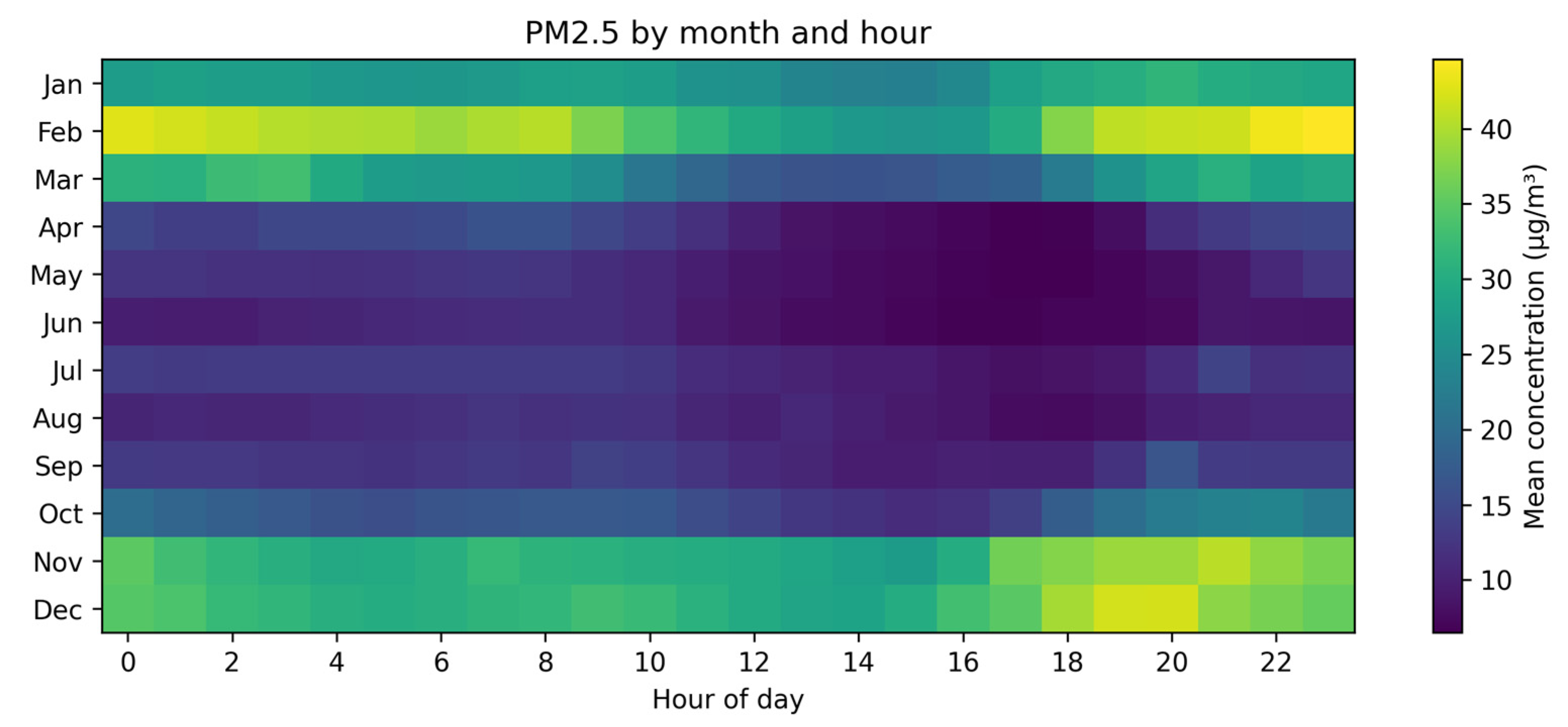 The heat-map analyses reinforce these interpretations by revealing systematic diurnal and seasonal structure. Weekday rush-hour peaks in PM