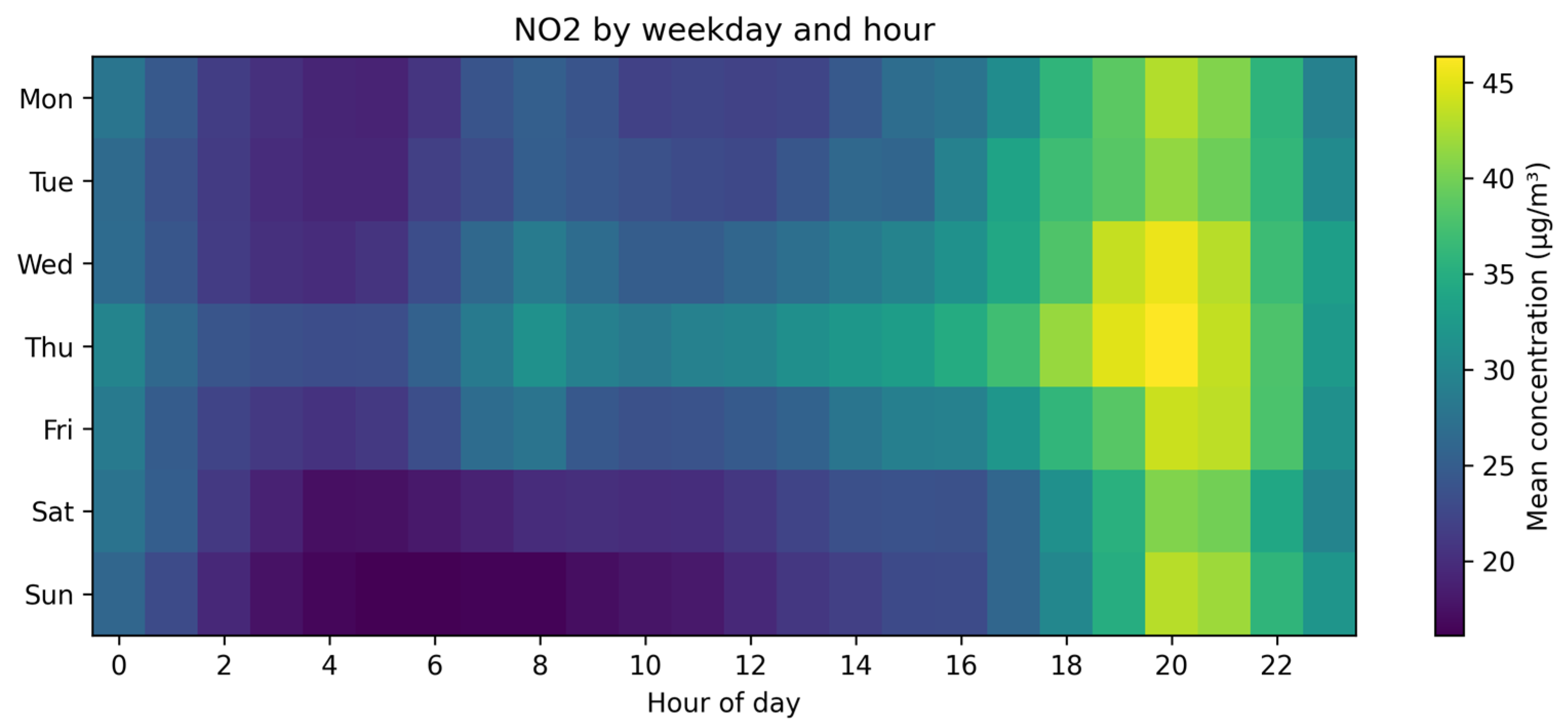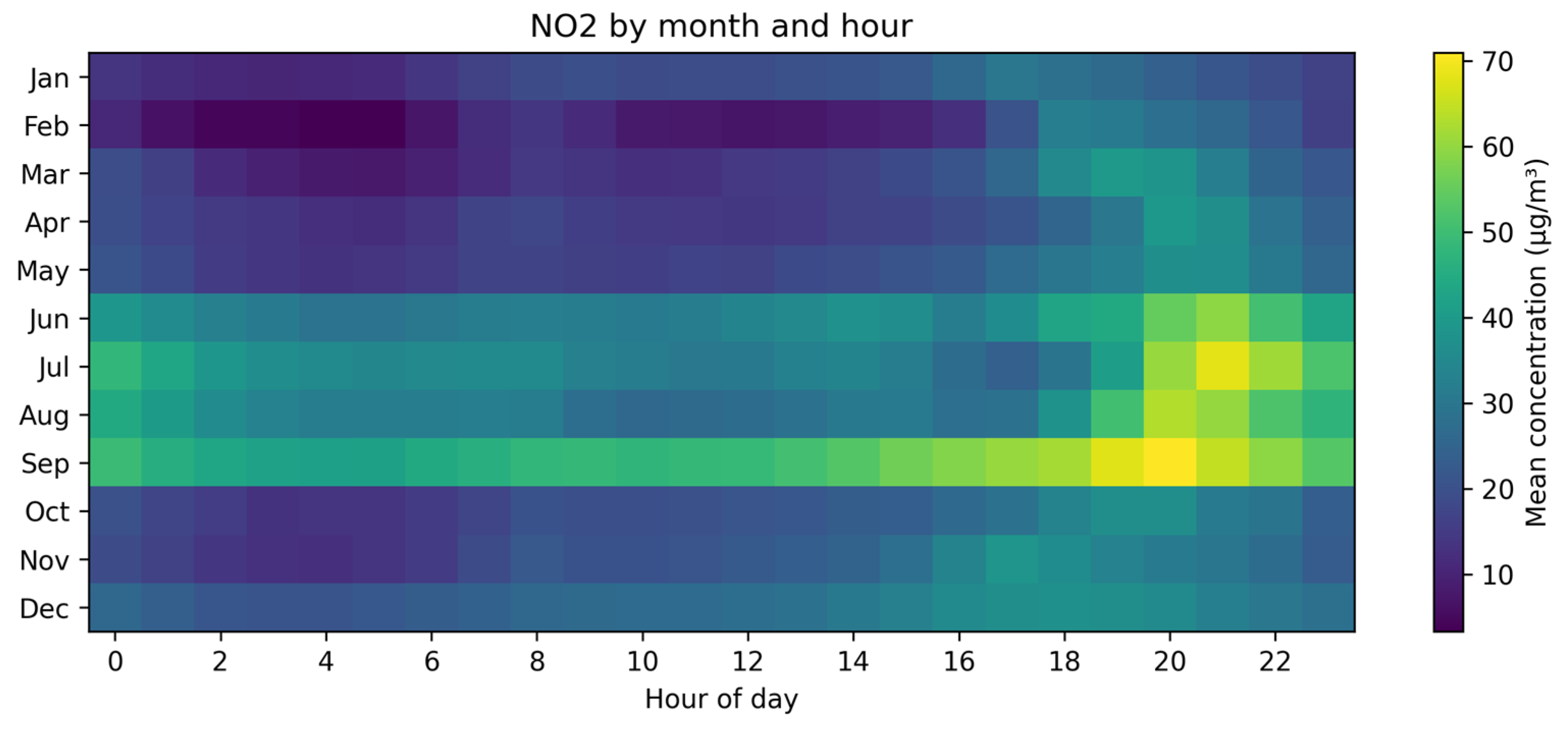 Figure 7). Weekend concentrations are substantially reduced across most hours of the day, and nighttime levels remain consistently low, highlighting strong short-term variability. Monthly heat-map analysis shows that elevated NO