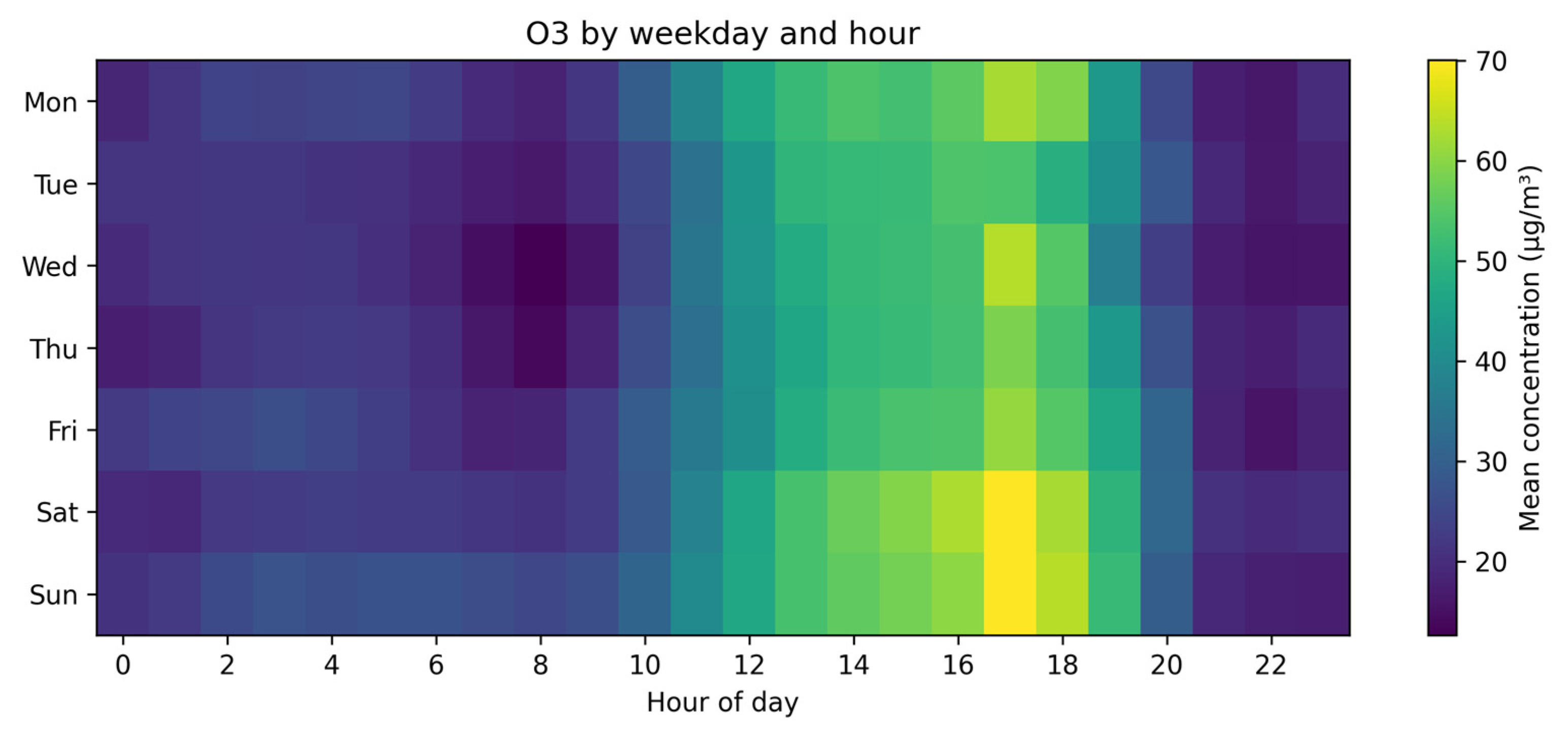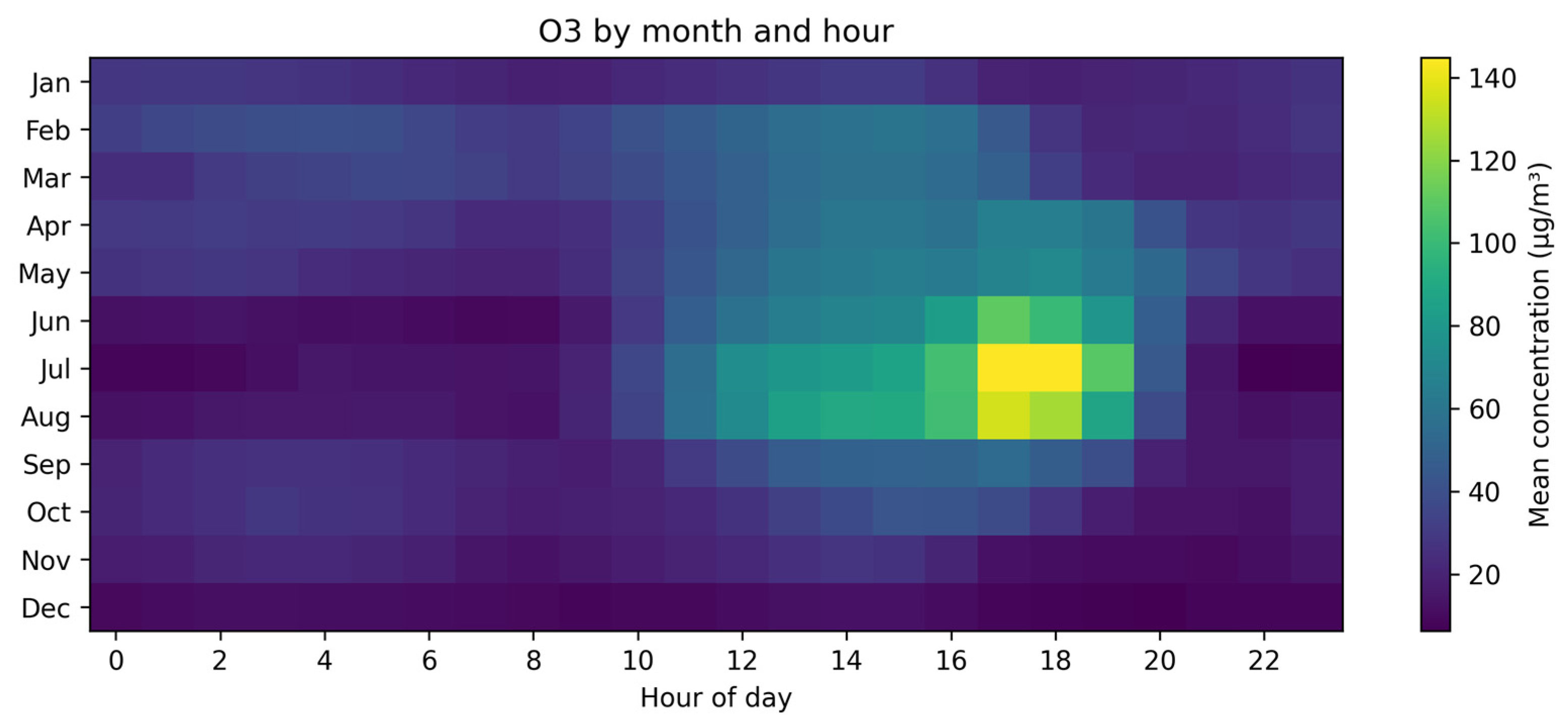 In contrast, O3 shows moderate negative correlations with both PM2.5 (r = −0.32) and NO2 (r = −0.29). These inverse relationships are consistently observed across the dataset and indicate that elevated O3 concentrations tend to coincide with lower levels of primary traffic-related pollutants. The magnitude of these correlations suggests a systematic but non-linear interaction rather than direct coupling. Together, the correlation structure highlights distinct temporal and chemical regimes for primary pollutants and secondary ozone and provides a quantitative basis for the contrasting diurnal and seasonal patterns observed in the heat-map analyses.