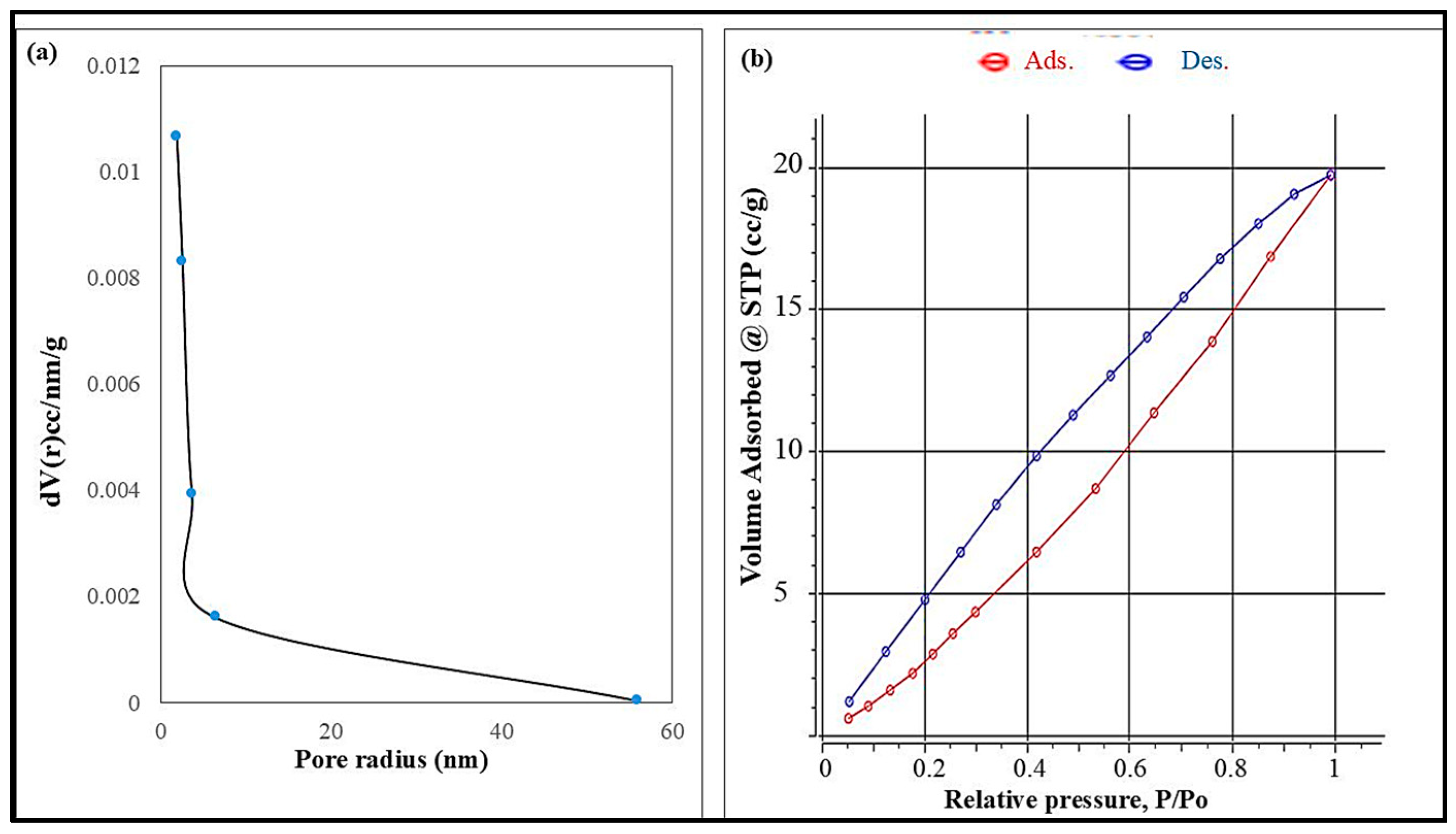 DM water was generated from a water purification system from Merck model Milli-Q SQ 2Series. The absorbance measurements were carried out by PerkinElmer UV-Vis spectrophotometer model LAMBDA 365+ (Waltham, MA, USA)). The IR spectrum was carried out by PerkinElmer FTIR spectrophotometer model Spectrum100 with universal attenuated total reflectance accessory (UATR). Metal analyses were carried out using PerkinElmer flame atomic absorption spectrometer, model PinAAcle 500. Surface area characterization was carried out through BET analysis, or Brunauer–Emmett–Teller analysis by Quantachrome surface area analyzer model NOVA Touch LX4 (Boynton Beach, FL, USA)) at National Research Center, Giza, Egypt. Morphology characterization was carried out through SEM analysis by Thermo Fischer Scientific SEM model Quanta FEG 250 and TEM analysis by JEOL TEM model JEM-2100 HRT (JEOL, Japan) at National Research Center, Giza. Structural characterization was carried out through XRD analysis by Bruker XRD model D8 Advance (Karlsruhe, Germany)) at National Research Center, Giza. Sample measurement was conducted using Agilent 5100 Synchronous Vertical Dual View (SVDV) ICP-OES (Mulgrave, Australia) with Agilent Vapor Generation Accessory VGA 7 at National Research Center, Giza, Egypt.