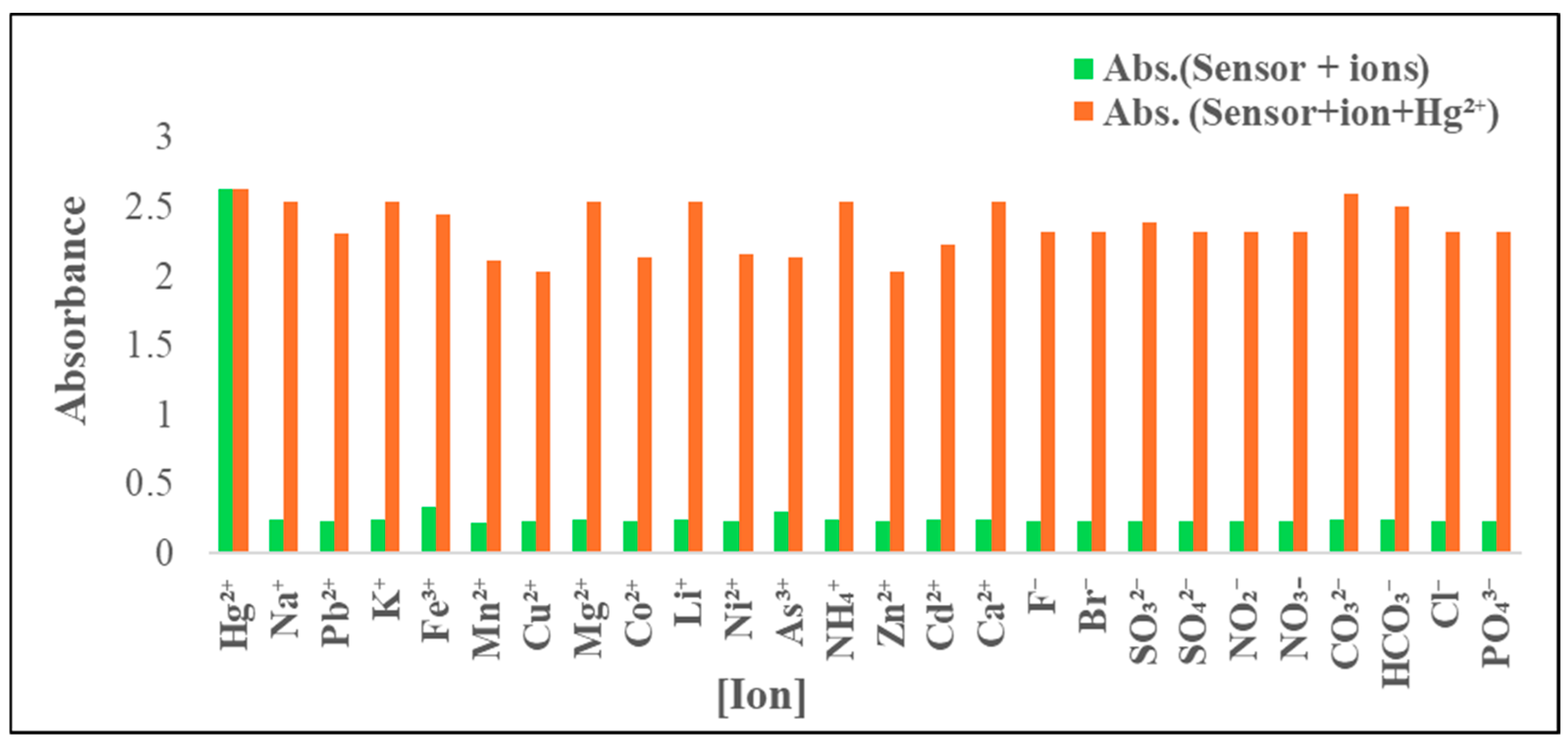2+, with minimal influence from competing ions. This high selectivity is attributed to the sensor’s strong binding affinity and specificity toward Hg