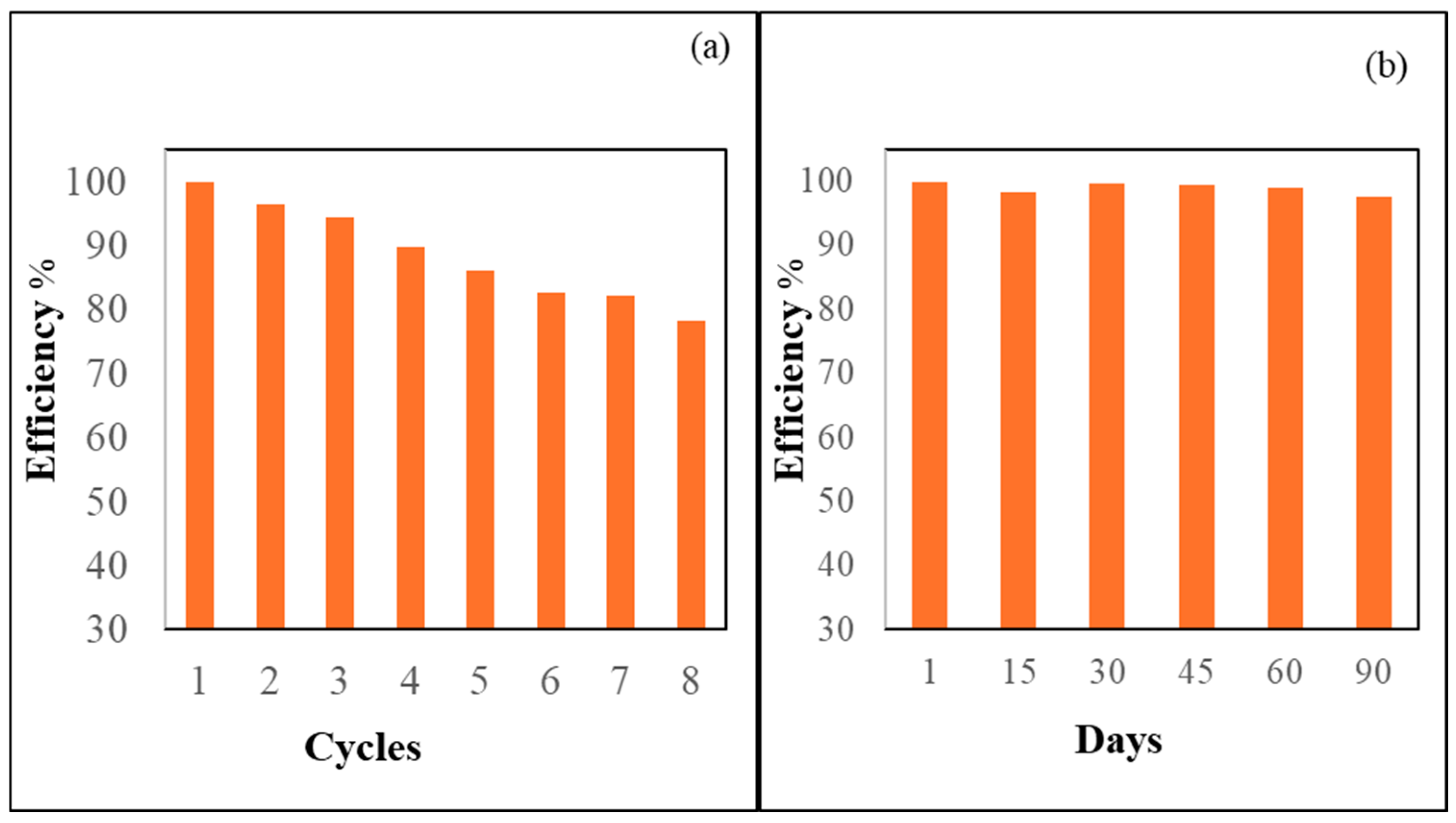 Figure 10a, the ADOL chemosensor retained approximately 86% of its original sensing performance even after five regeneration cycles. This result indicates that the material maintained substantial functionality and adsorption efficiency upon reuse, supporting its application in repeated real-sample analyses.
