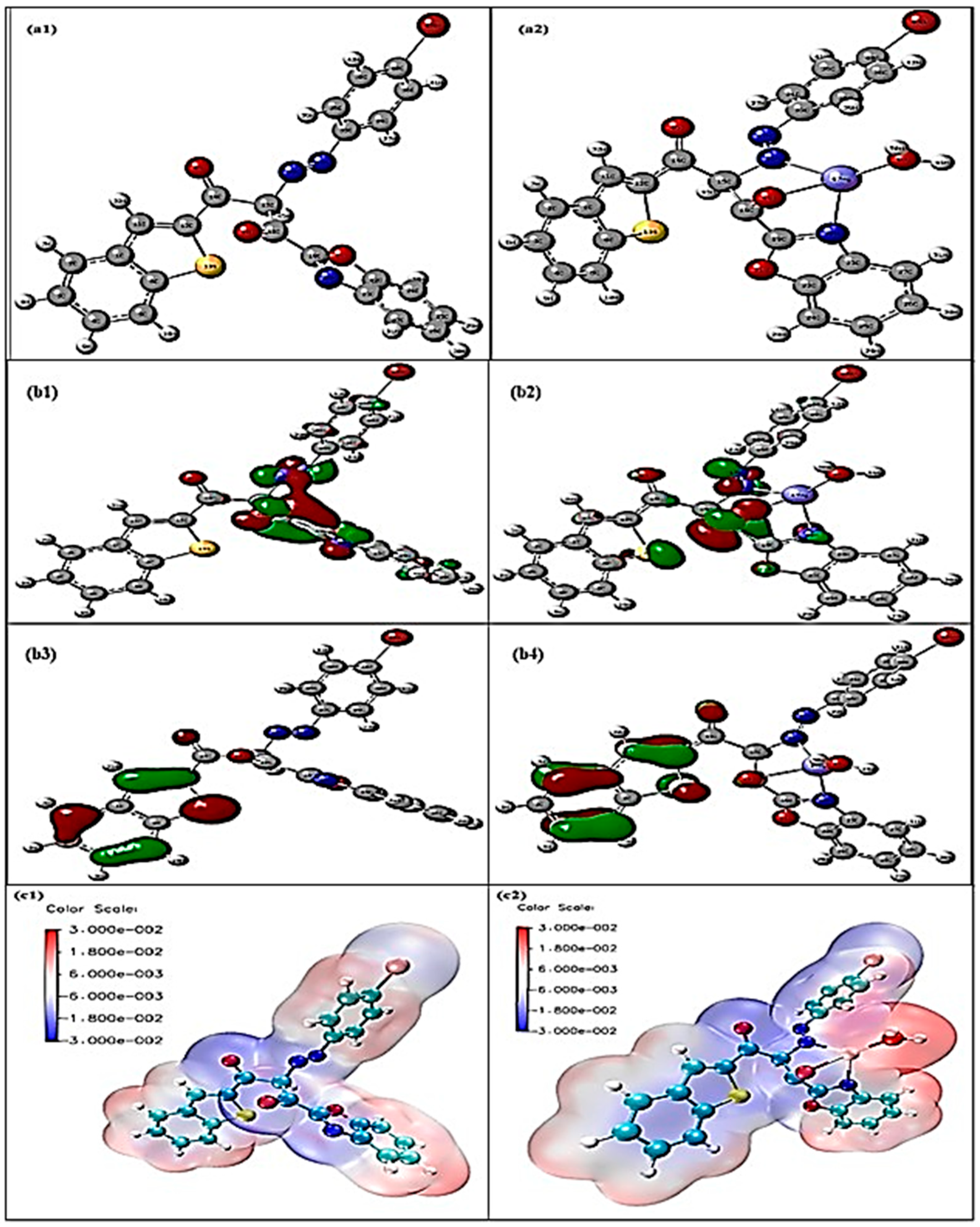 Figure 11a1,a2. The free ligand displays a nearly planar conformation with extended π-conjugation through the aromatic rings and azomethine group. The C=N bond length (1.29309 Å) lies within the typical imine range, while aromatic C–C (1.382–1.417 Å), O–H (0.975 Å), and benzothiazole parameters (C–S = 1.752 Å, C–N = 1.386 Å, N-N = 1.244Å, AND C-O = 1.204 Å) agree with reported values, confirming the reliability of the model. Upon complexation, Hg (II) binds via two azomethine nitrogens and two deprotonated phenolic oxygens, generating a distorted tetrahedral geometry. The Hg–N (2.192–2.198 Å) and Hg–O (2.049–2.202 Å) bond lengths are consistent with experimental data. Coordination leads to elongation of the C=N bonds (to 1.333 Å, N-N = 1.272 Å) and C–O bonds (to ~1.294 Å), reflecting electron donation to the metal. The ligand backbone twists significantly, with a dihedral angle of ~77° between the phenolic planes. Bond angles around Hg deviate from ideal. Both the free ligand and complex converge to true minima without imaginary frequencies, confirming structural stability. The geometric parameters and distortions observed are in excellent agreement with reported mercury–Schiff base complexes.