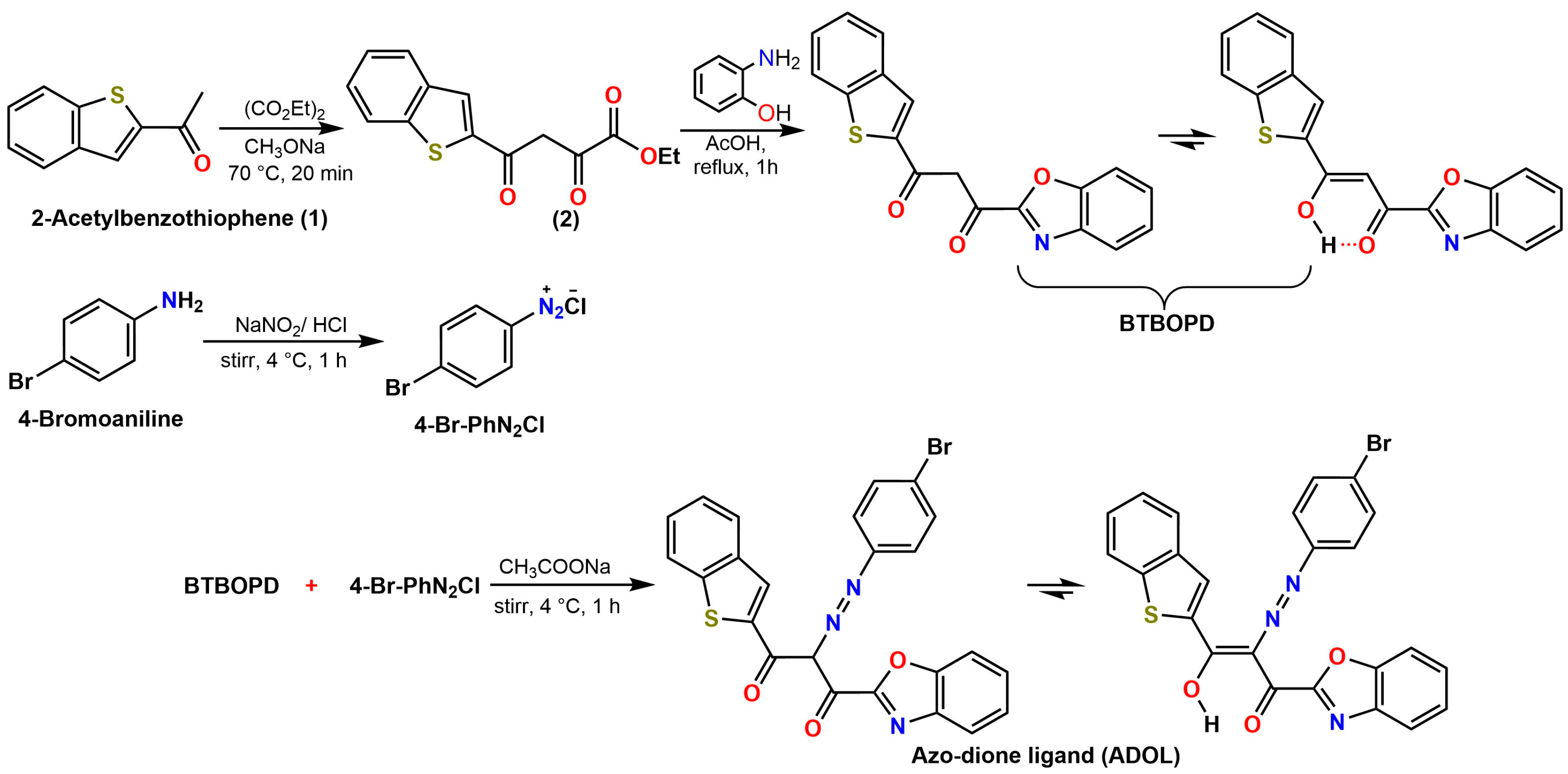 2) via a Claisen condensation between 2-acetylbenzothiophene and diethyl oxalate, wherein sodium methoxide catalyzes the reaction at a temperature of 70 °C. The subsequent reaction of compound 2 with 2-aminophenol in acetic acid yields 1-(benzo[b]thiophen-2-yl)-3-(benzo[d]oxazol-2-yl) propane-1,3-dione (BTBOPD), a β-diketone displaying intramolecular hydrogen bonding. This equilibrium is in fact quite characteristic of 1,3-diketones in general. Simultaneously, 4-bromoaniline is diazotized with NaNO