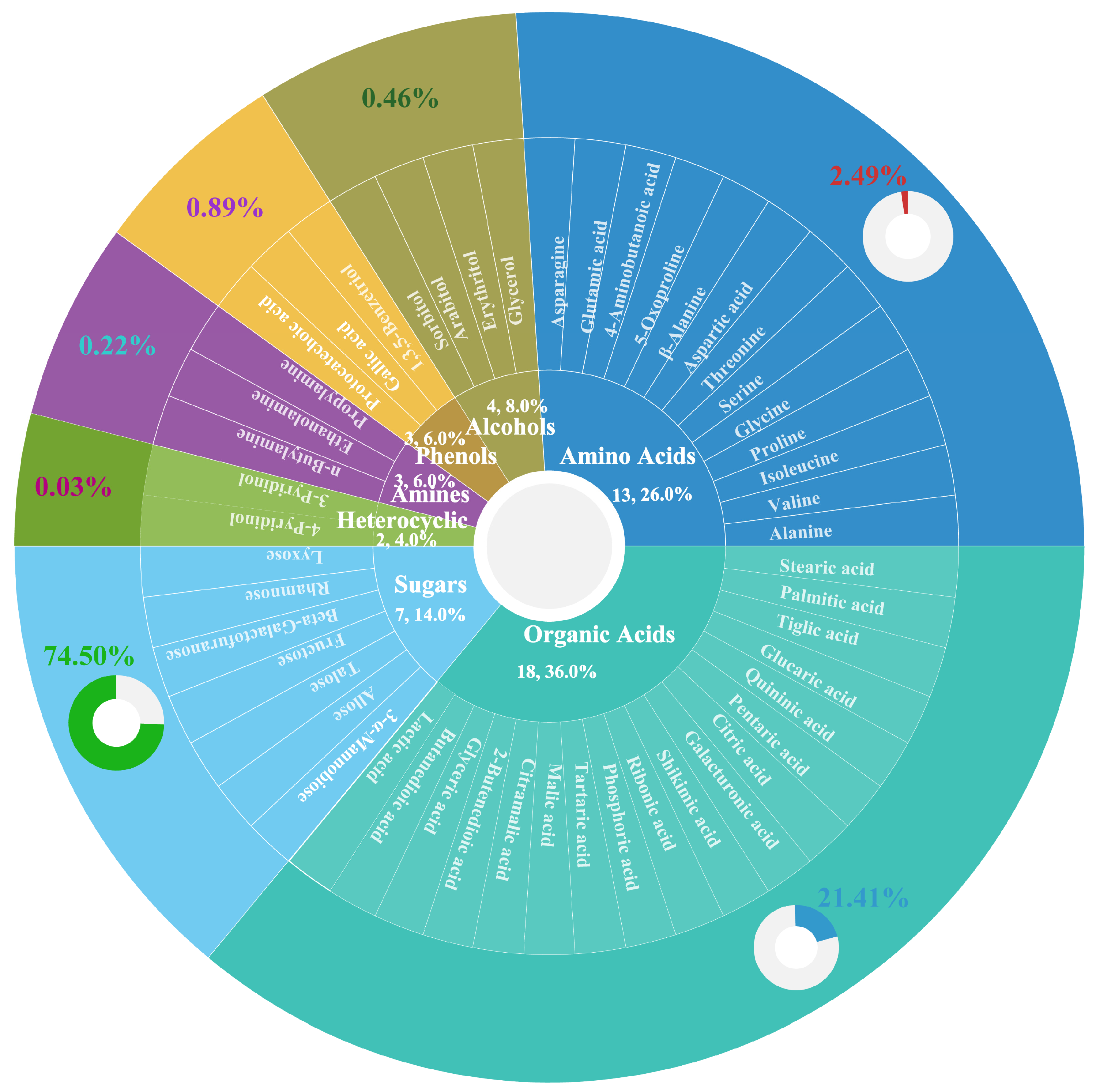 3.3. Dynamics of Primary and Secondary Metabolomics in CS at Different Growth Stages
