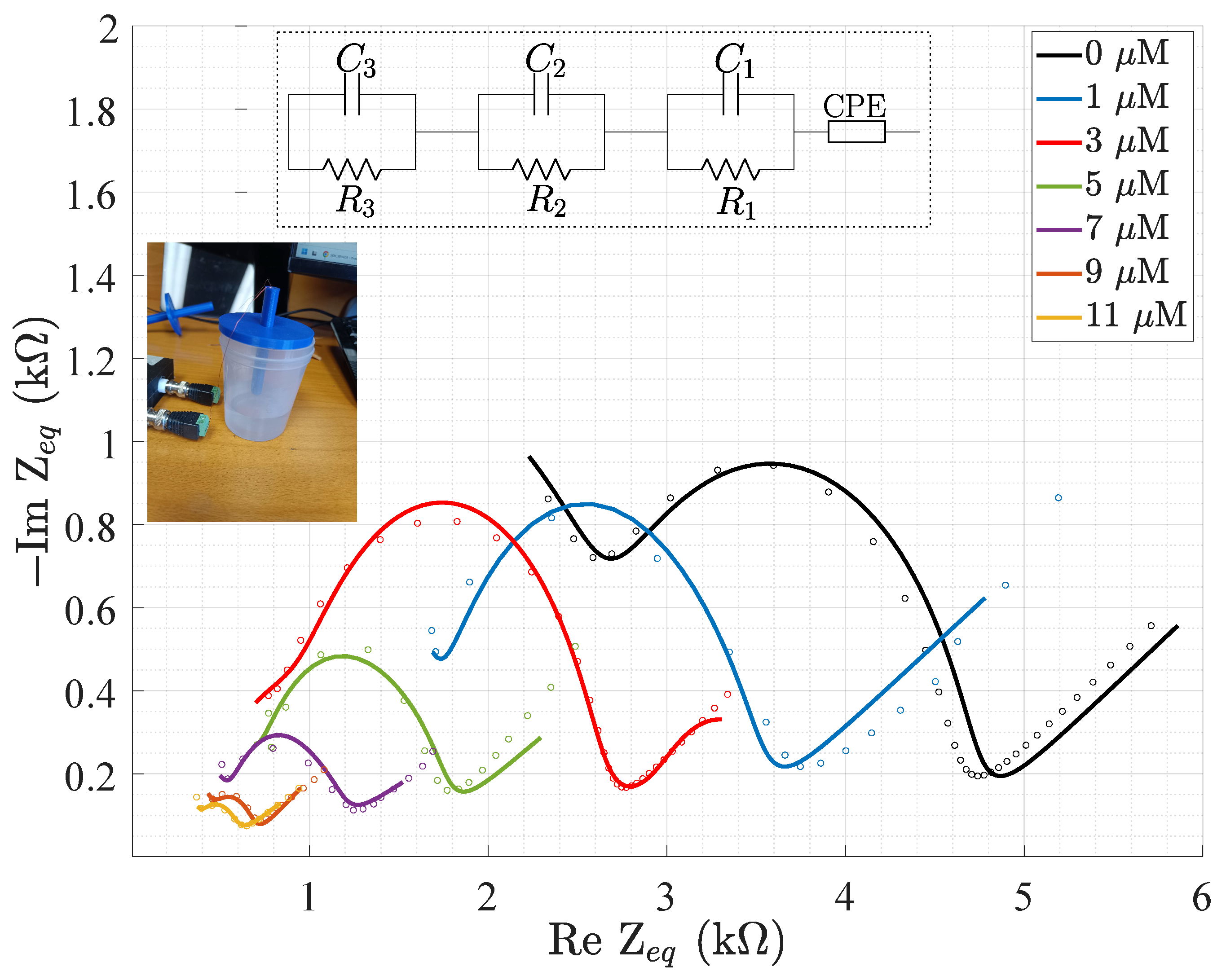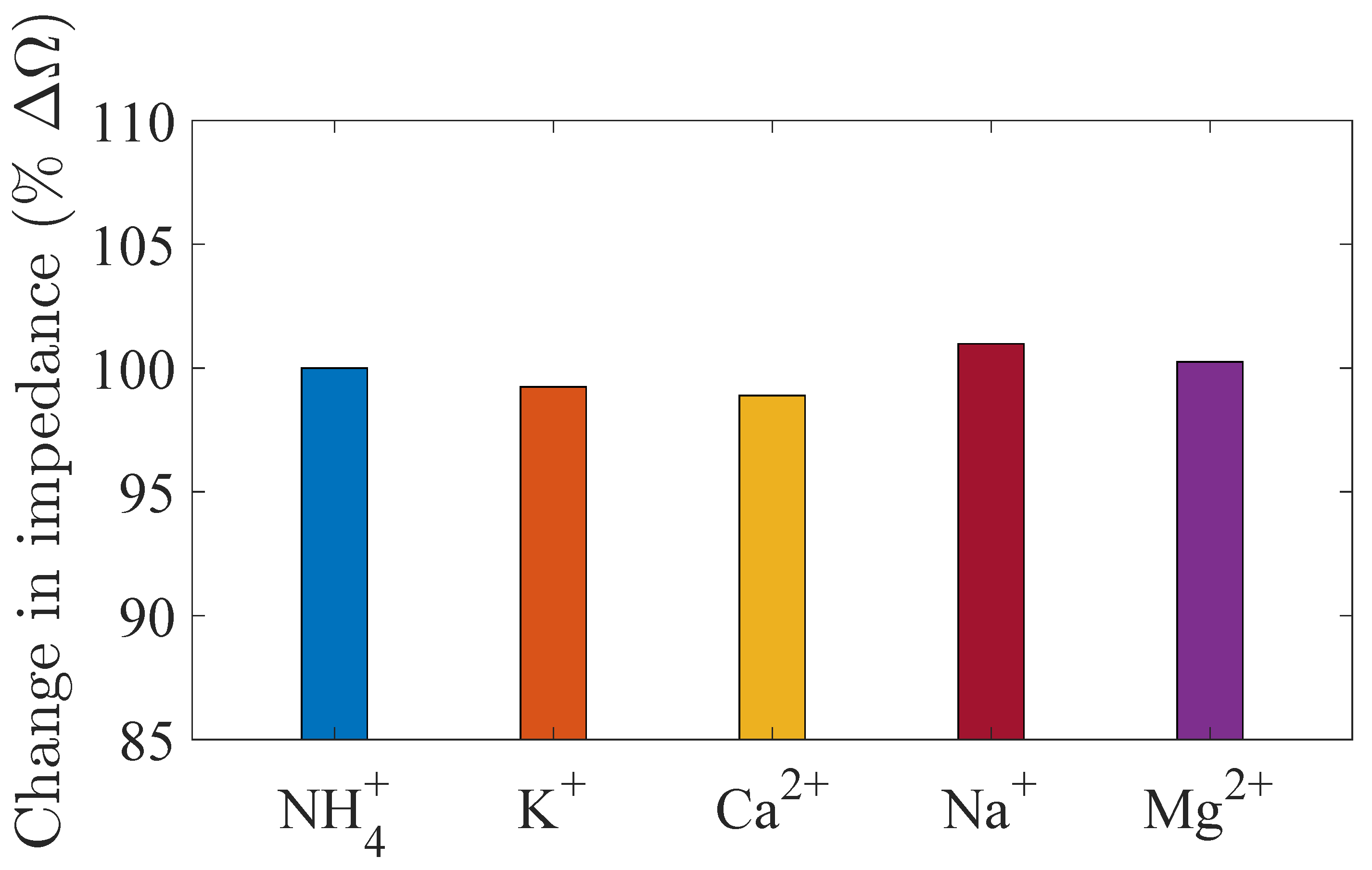 - Zougar, S.; Morakchi, K.; Zazoua, A.; Saad, S.; Kherrat, R.; Jaffrezic-Renault, N. Characterization of Ammonium Ion—Sensitive Membranes in Solution with Electrochemical Impedance Spectroscopy. Mater. Sci. Eng. C 2008, 28, 1020–1023. [Google Scholar] [CrossRef]