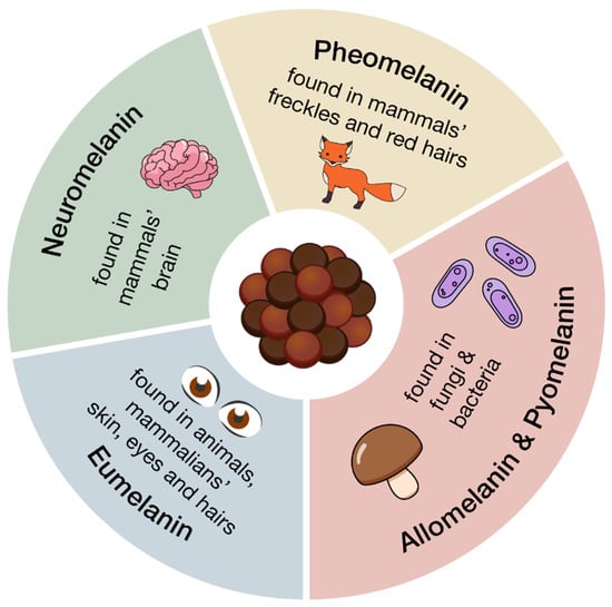 Melanin is a generic term, indicating a family of biologically significant pigments that can be classified, based on their chemical precursor and structure, into five main categories (summarized in Figure 1 and Figure 2 and Table 1): eumelanin, pheomelanin, neuromelanin, allomelanin, and pyomelanin [24,27]. The chemical composition of these biopolymers includes the presence of diverse functional groups, which enable melanins to interact with various organic compounds, both through hydrogen bonding, and π-π stacking, and contribute to their varied coloration and functional properties [23,27,28,29,30].